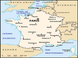 The document lists famous landmarks and locations in Paris such as the Eiffel Tower, Notre Dame Cathedral, the Louvre museum which houses the Mona Lisa, Sacré Coeur basilica, the artistic Montmartre neighborhood, and the Disneyland Paris theme park located just outside the city. It provides a brief tour of some of the most iconic sights and places to visit in the beautiful city of Paris, France.