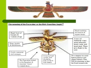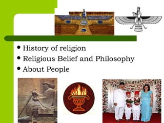 Zoroastrianism, founded by the Persian prophet Zoroaster around 600 B.C. in Northern Iran, is the first monotheistic religion, centered on the worship of Ahura Mazda, the supreme god, and beliefs in duality between good (Ahura Mazda) and evil (Angra Mainyu). The religion emphasizes moral conduct, the sanctity of elements, and rituals, with the Avesta as its holy scripture, comprising teachings, prayers, and ceremonies. Despite its historical prominence, Zoroastrianism faces a declining population today, with significant contributions to various fields but challenges in maintaining their community's numbers and identity.