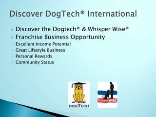 This document introduces the Dogtech & Whisper Wise franchise business opportunity in the pet services industry. It discusses how the global pet services industry is large and growing, valued at $60 billion annually. It outlines how Dogtech provides much needed dog training services and products to address owners' expectations for well-behaved dogs that can socialize in public. Starting a Dogtech franchise business allows operators to benefit from the growing demand for pet services through an excellent income, great lifestyle, and rewards.