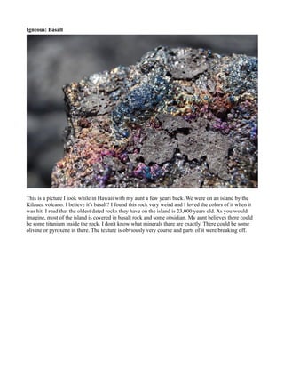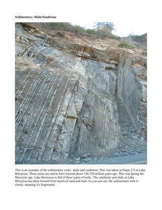 This document provides examples and descriptions of different types of rocks, including sedimentary (shale, sandstone, limestone), igneous (basalt, granite), and metamorphic (marble). The sedimentary rocks were described as being formed from layers of sand and mud 130-150 million years ago in Napa, CA. The igneous basalt was seen in Hawaii near a volcano and is estimated to be 23,000 years old. Granite was observed in Stanislaus National Forest with a coarse texture. Tennessee marble found in city hall was formed 4600 million years ago from bryozoan accumulations. Limestone in Hayward, CA city hall is 450 million years old Kasota stone