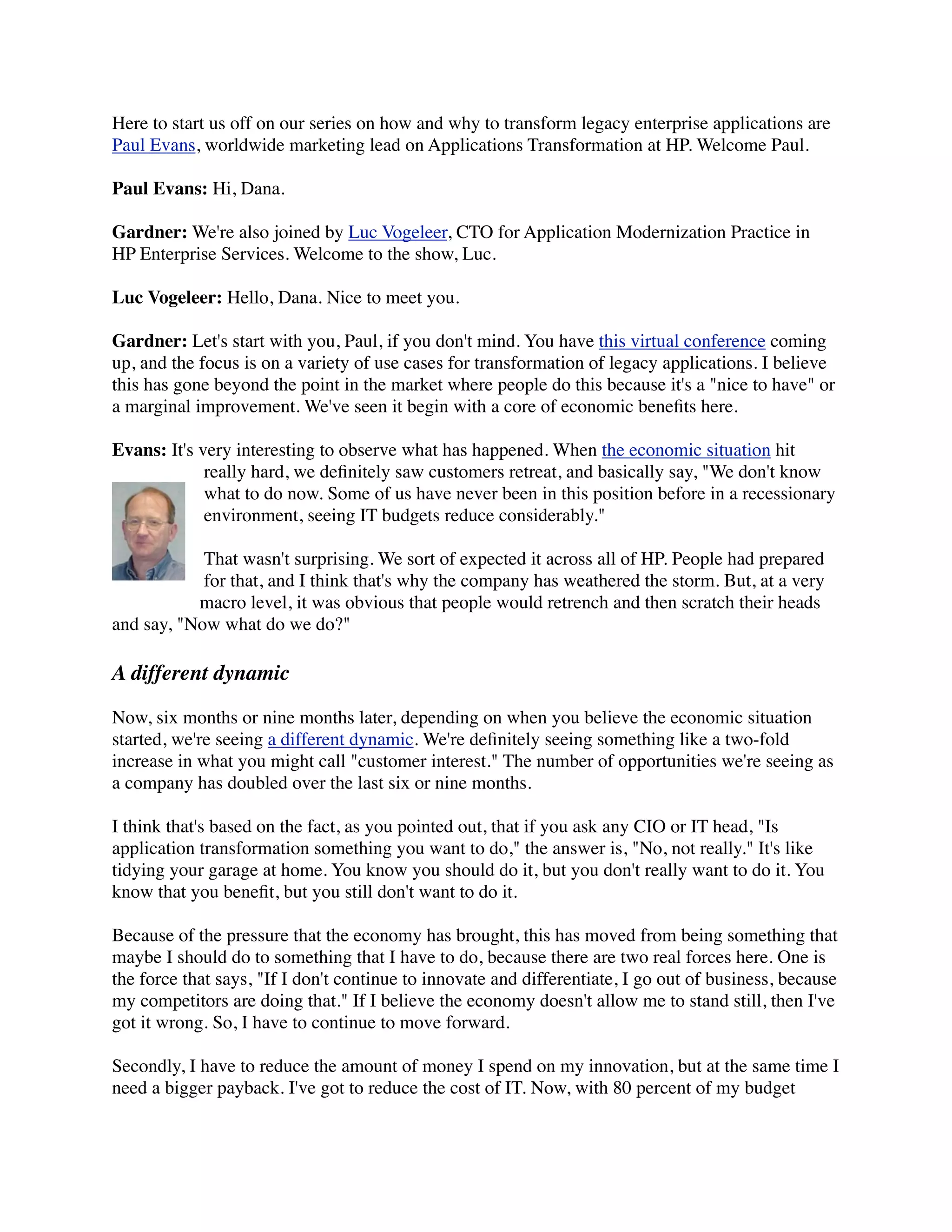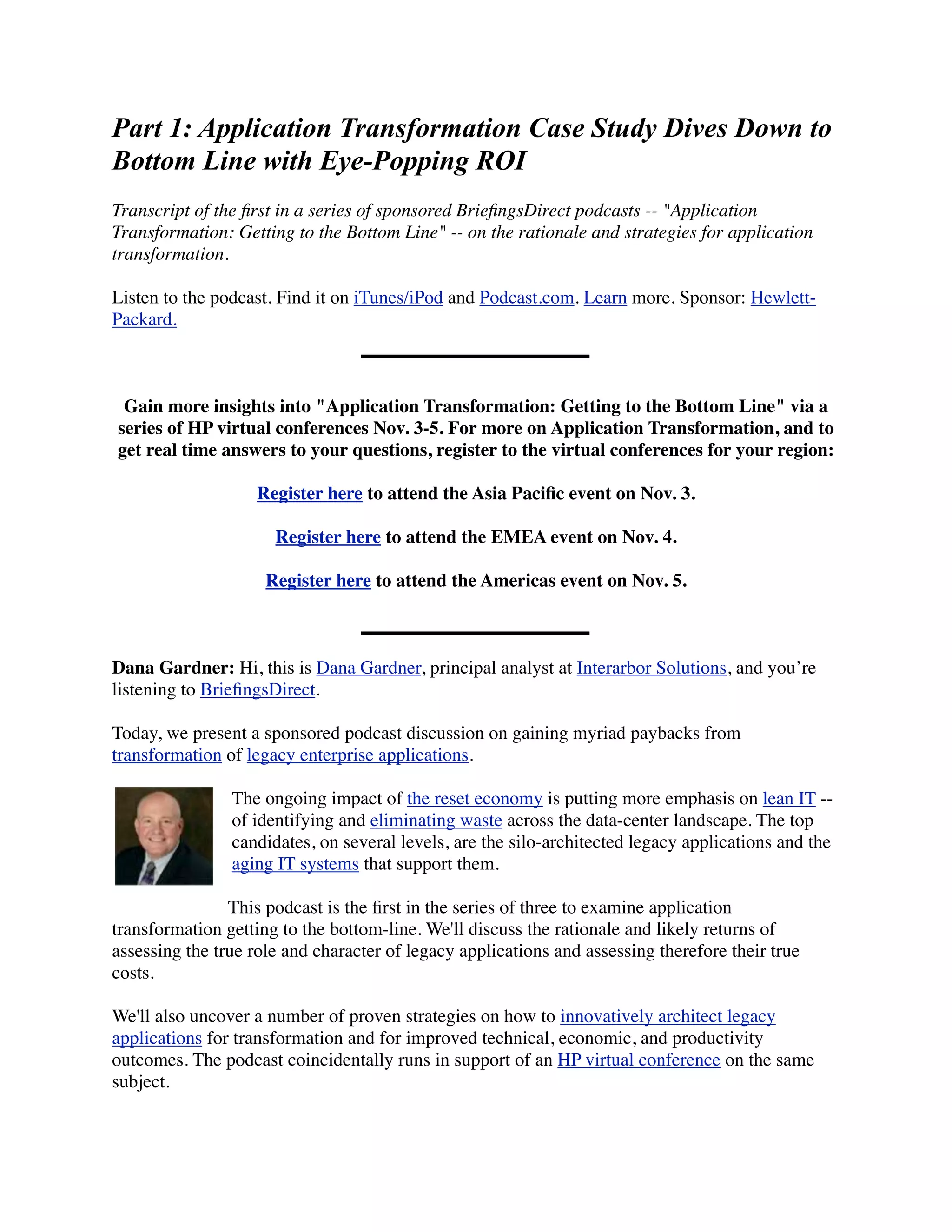 The document provides insights from a podcast discussing application transformation, emphasizing its necessity for businesses to innovate and reduce costs amidst economic pressures. It highlights a case study involving the Italian Ministry of Education, detailing their modernization efforts of legacy systems to improve agility and reduce expenditures. The discussion underscores the need for strategic planning and a holistic approach to transforming legacy applications, ultimately leading to significant ROI and enhanced operational efficiency.