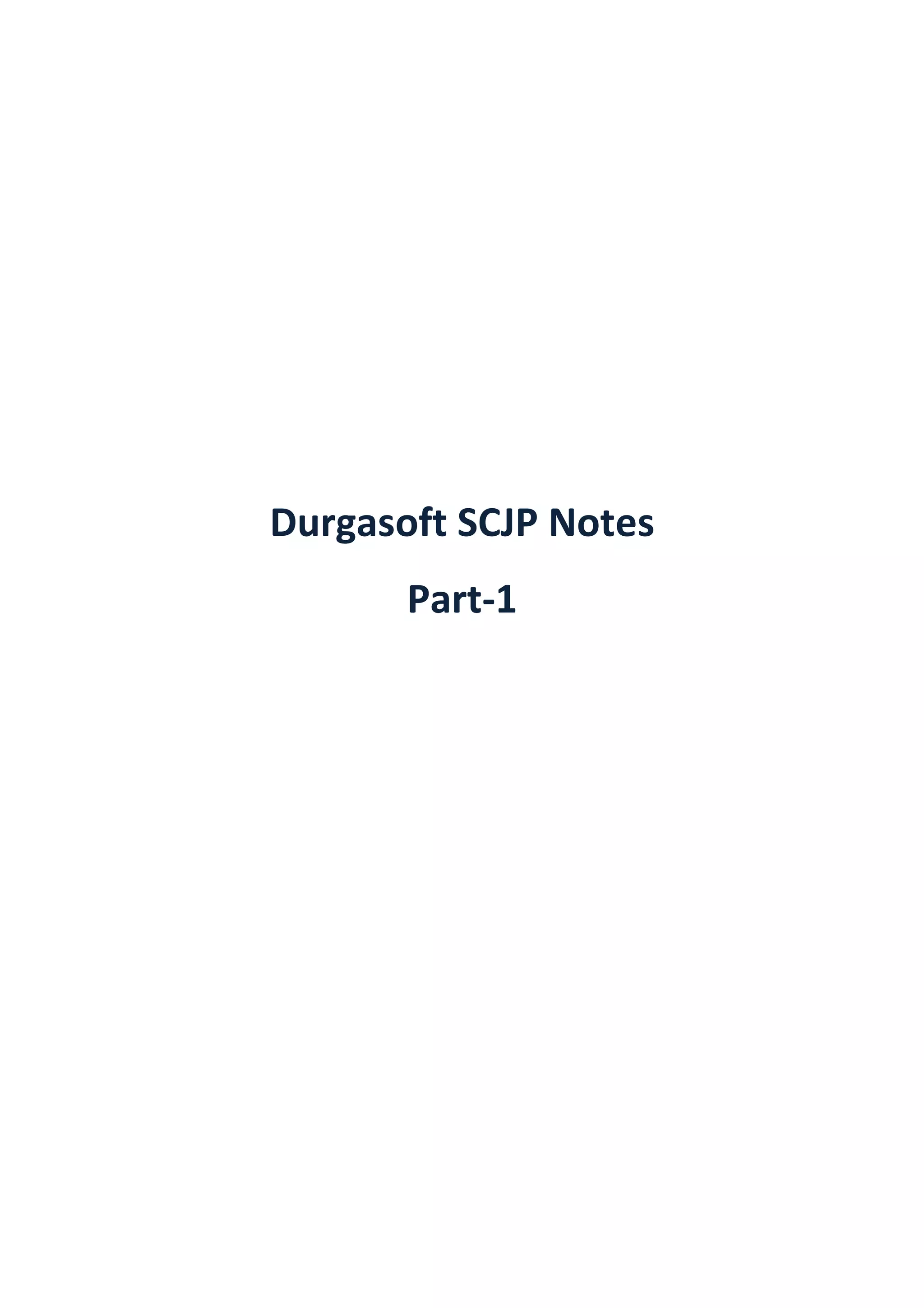 This document contains notes related to the SCJP exam. The notes cover Part 1 of the exam and include information on Java programming fundamentals such as variables, operators, control flow, exceptions, and more. Overall, the document provides an overview of core Java concepts tested in Part 1 of the Oracle Certified Professional, Java SE Programmer certification.