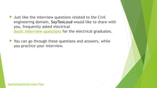 This document contains frequently asked electrical engineering interview questions and their answers. It discusses system definitions, types of control systems including open loop and closed loop systems, latching current which is the minimum current needed to keep a thyristor switched on, reverse power relays which prevent power flow from the grid to a generator, and knee point voltage which is the saturation point of a current transformer. The document is divided into multiple sections with questions and detailed answers to help electrical engineering graduates prepare for interviews.