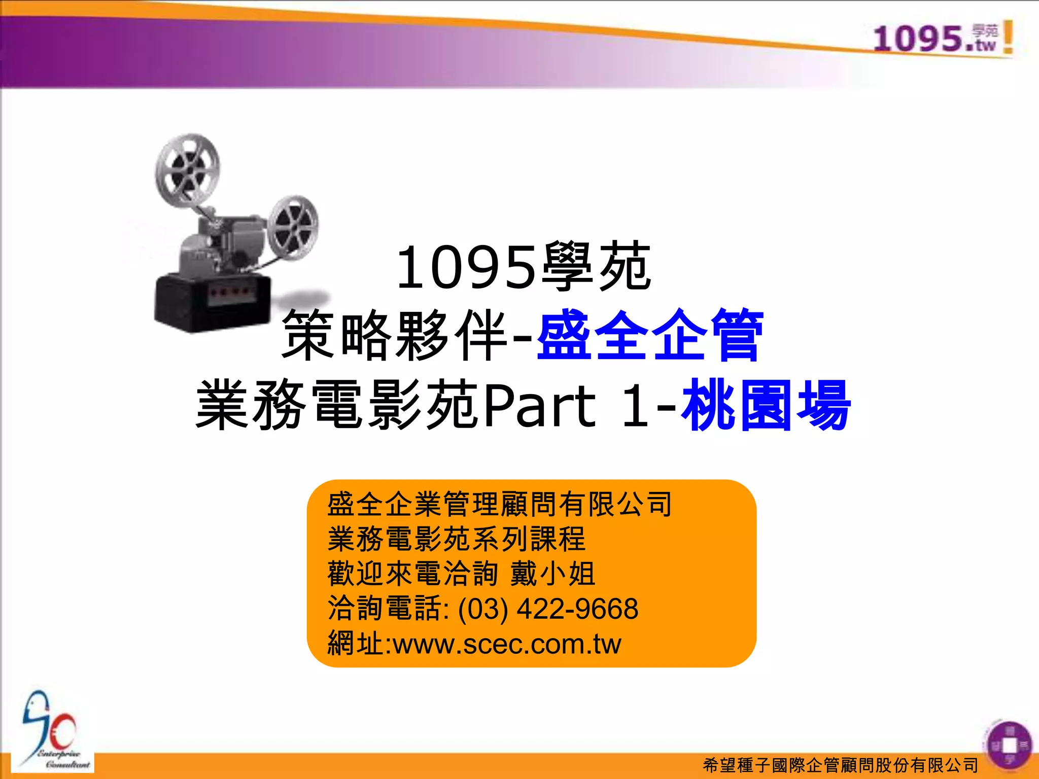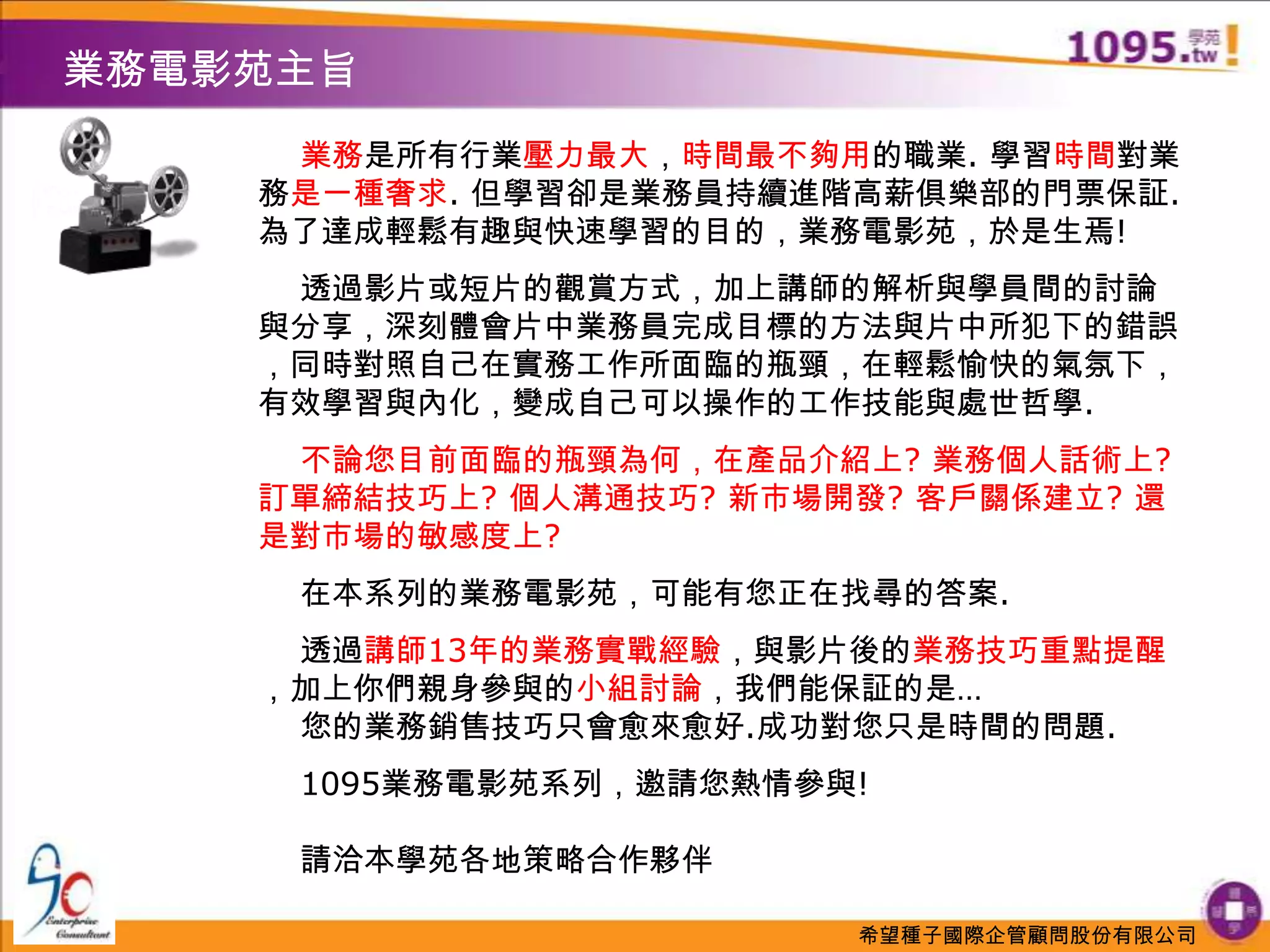本文件介绍了盛全企业管理顾问有限公司的业务电影苑系列课程,旨在通过影片和讨论帮助销售人员提高自身的销售技巧和业务能力。课程内容包括业务科学方程式、优先地图等,旨在解决销售过程中的实际问题。参与者需提前报名,名额有限,活动在桃园市举行。