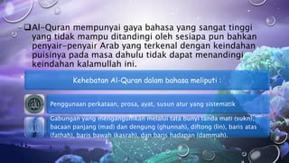 Dokumen tersebut membahas mengenai mukjizat Al-Quran dalam beberapa aspek, yaitu: