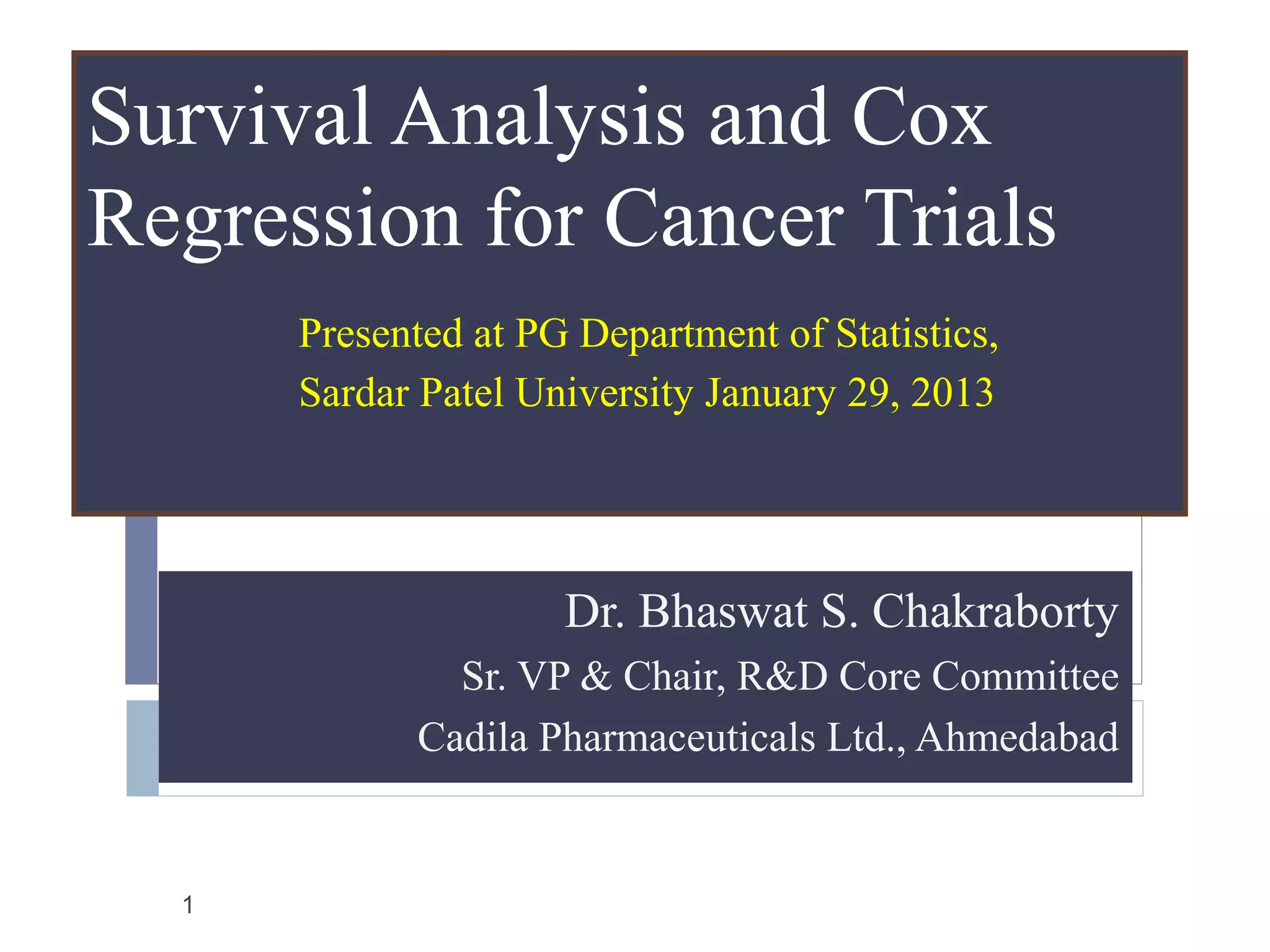 This document discusses survival analysis and Cox regression for cancer clinical trials. It begins with an introduction to Cox regression analysis and how it can be used to analyze the effects of covariates on survival rates in cancer trials. The document then provides examples of Cox regression outputs and how to interpret the results, including checking the proportional hazards assumption. It cautions against some invalid methods of survival analysis that do not properly account for censored or time-dependent data.