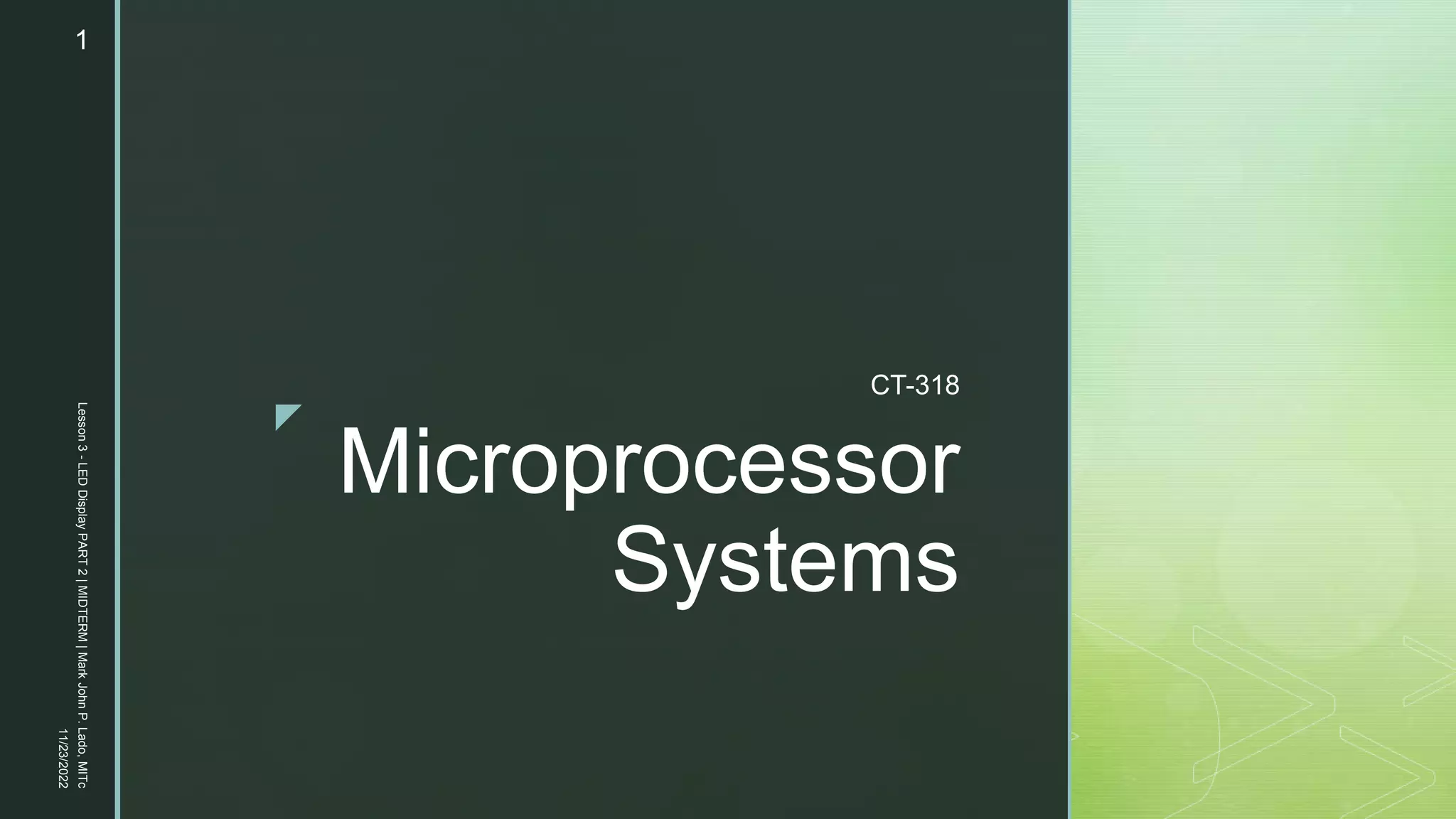 The document covers Lesson 3 of a microprocessor systems course focused on Arduino programming, specifically on working with LED displays. Key topics include programming concepts such as variables, data types, arithmetic, and control structures (if statements, loops). The lesson aims to equip learners with skills to utilize these concepts in practical Arduino projects.