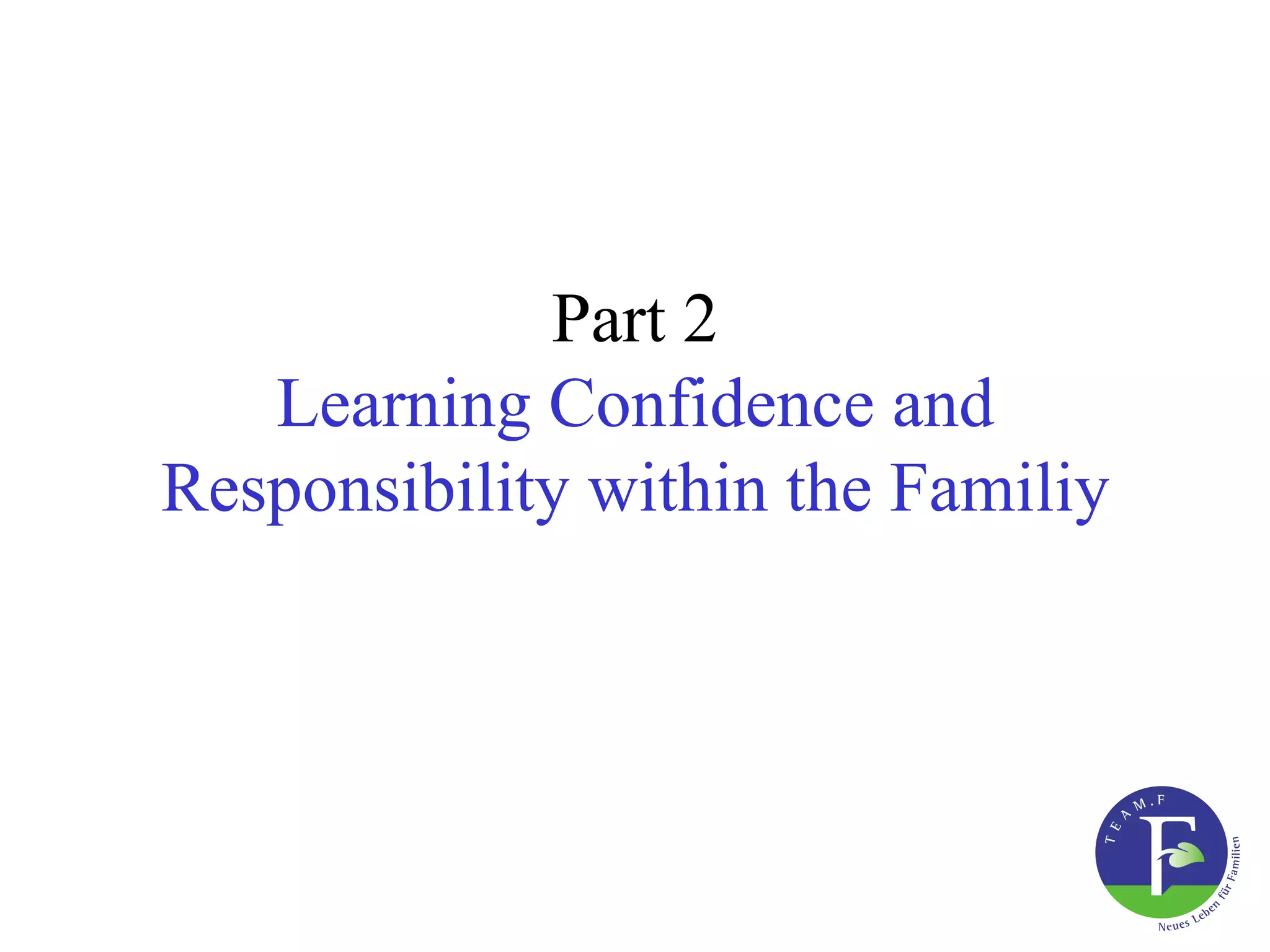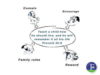 This document discusses building confidence and responsibility in children through a loving family environment that reflects God's character. It emphasizes using God's guidance, instruction, and unconditional love as the foundation for strong relationships and teaching children respect, honesty, self-control and other values. Parents are encouraged to diligently teach biblical principles by example through attention, creativity and time with their children. Each child's unique abilities and needs should be considered to train them according to their inclinations. Rewards can be used to encourage learning new behaviors but should not replace daily responsibilities or become the focus of parenting.