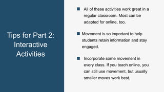This document provides instructions for several interactive classroom activities that incorporate movement to help students stay engaged. The activities can be adapted for both in-person and online classes. They include having students work together to form shapes with ropes blindfolded, compete in word relay races at the board, build stories together one word at a time with actions, walk around adding to posters on the walls, and ask each other yes/no questions to figure out identities or secrets. The goal is to make learning more fun and interactive.