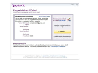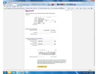 The document provides instructions for setting up a Yahoo email account, emphasizing the importance of using a secure password. Additionally, it explains how to check email, print messages, and reply or compose new emails within the interface. Users are advised on potential pitfalls, such as printing unwanted ads by using the browser's print option.