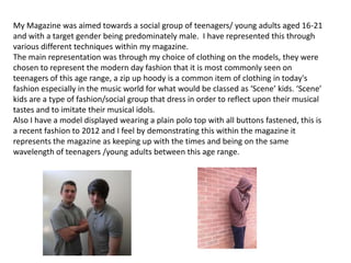 This document discusses a magazine aimed at teenagers and young adults aged 16-21, primarily males. The magazine represents this target audience through fashion choices shown in photos, such as hoodies and polo shirts. It also features an emotional article about a band member's personal issues to engage readers who may be experiencing similar feelings. The magazine would likely be distributed by Bauer Media Group, as they publish musical magazines like Kerrang and Q targeted at younger audiences, which is important since this magazine aims to reach student Explorers.