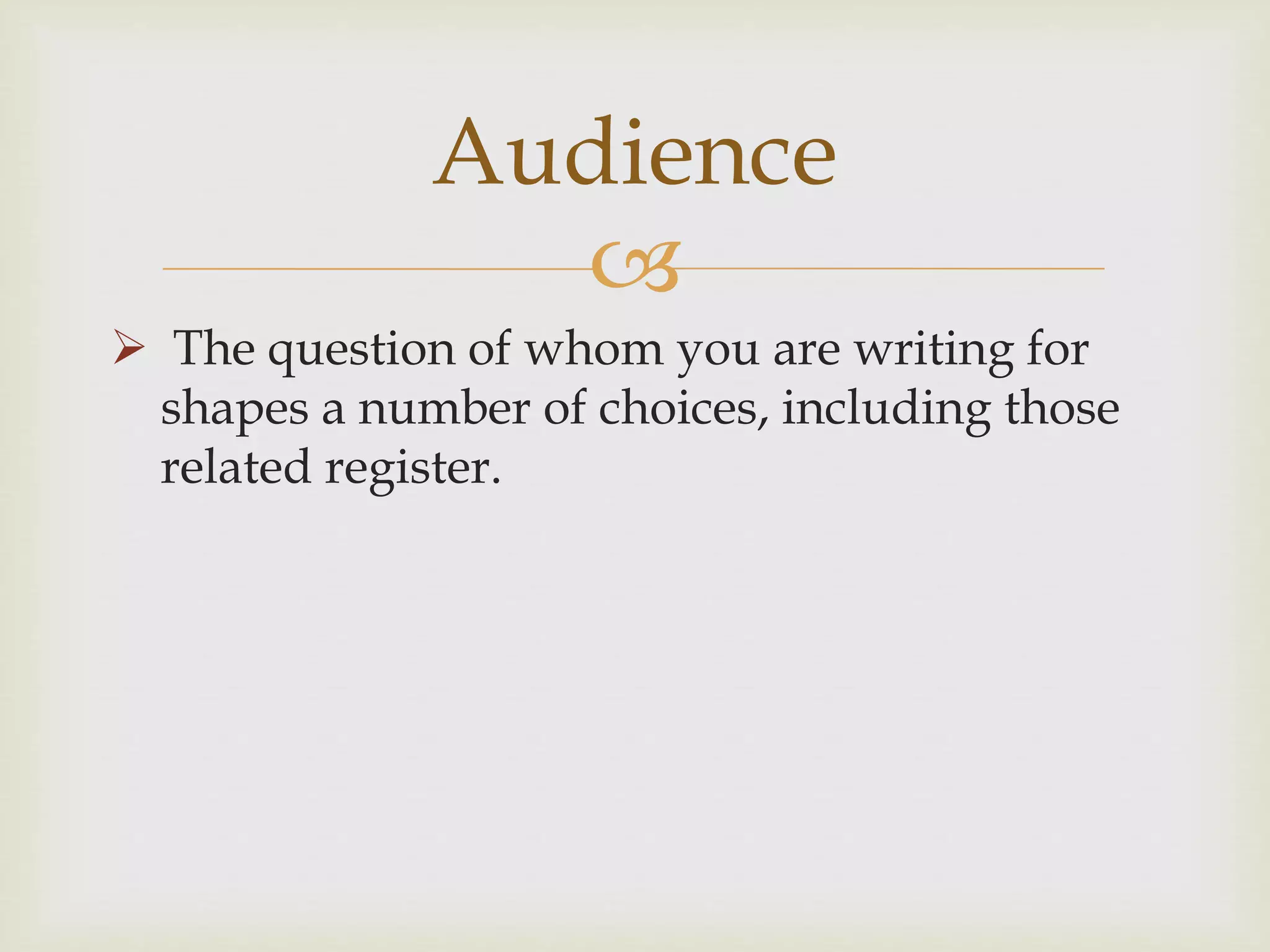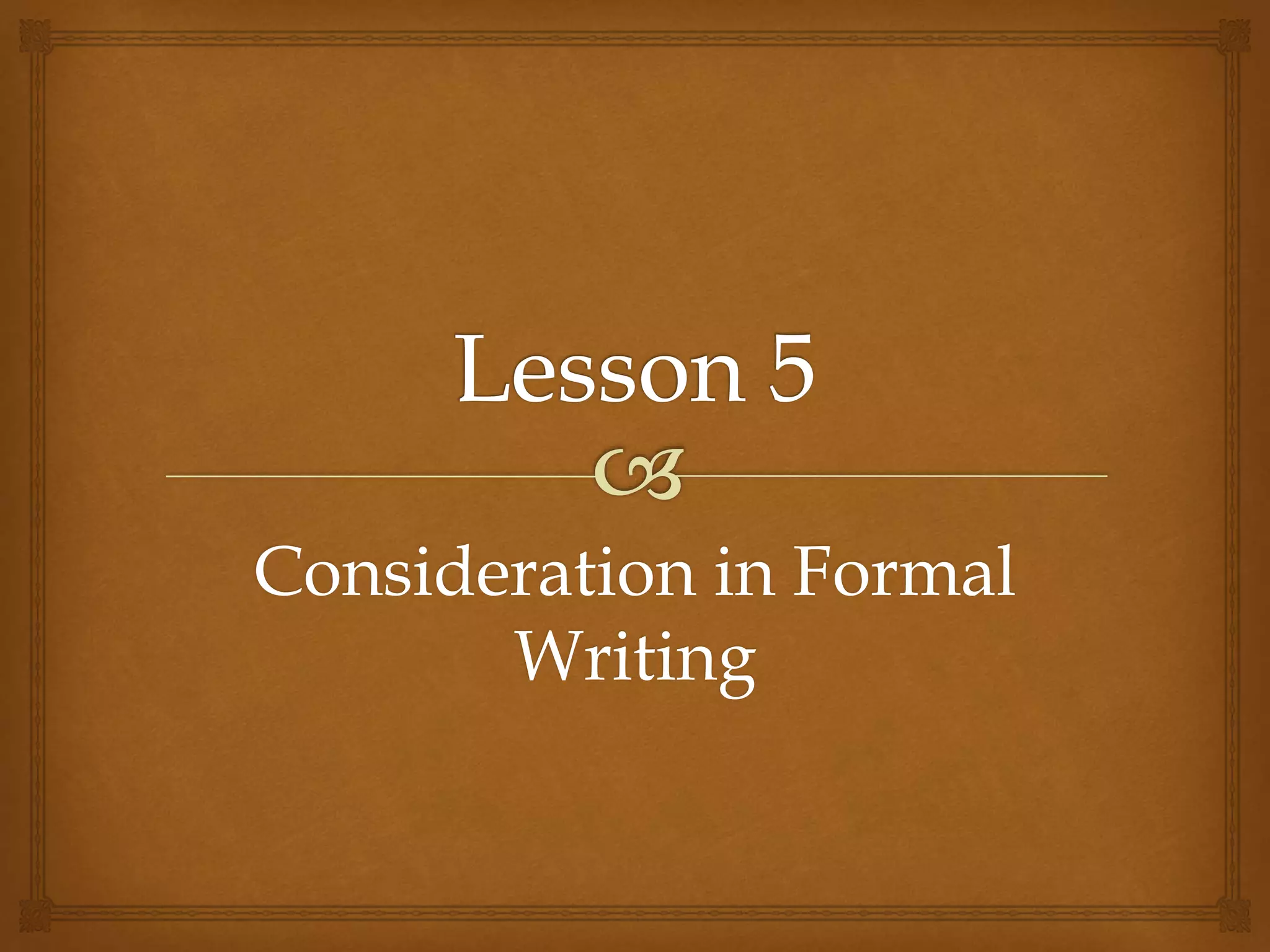 This document discusses considerations for formal writing. It addresses choosing an organizational pattern based on audience and purpose, such as SPSE for reports and IMRD for research articles. Style and flow are also important - style relates to the purpose, tone for the audience, and content of each paragraph, while flow moves the reader through the text. Formal writing should avoid informal language and errors, and position the writer as part of their discourse community.