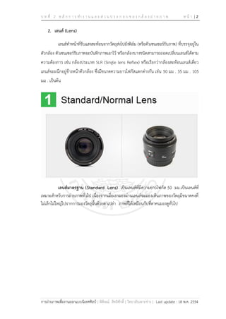 2 ห ลั ก ก า ร ทา ง า น แ ล ะ ส่ ว น ป ร ะ ก อ บ ข อ ง ก ล้ อ ง ถ่ า ย ภ า พ ห น้ า | 2 การถ่ายภาพเพื่องานออกแบบนิเทศศิลป์ | พิพิษณ์ สิทธิศักดิ์ | วิทยาลัยเพาะช่าง | Last update : 18 พ.ค. 2554 2. เลนส์ (Lens) เลนส์ทาหน้าที่รับแสงสะท้อนจากวัตถุส่งไปยังฟิล์ม (หรือตัวเซนเซอร์รับภาพ) ที่บรรจุอยู่ใน ตัวกล้อง ตัวเซนเซอร์รับภาพจะบันทึกภาพเอาไว้ หรือกล้องบางชนิดสามารถถอดเปลี่ยนเลนส์ได้ตาม ความต้องการ เช่น กล้องประเภท SLR (Single lens Reflex) หรือเรียกว่ากล้องสะท้อนเลนส์เดี่ยว เลนส์จะผนึกอยู่ข้างหน้าตัวกล้อง ซึ่งมีขนาดความยาวโฟกัสแตกต่างกัน เช่น 50 มม . 35 มม . 105 มม . เป็นต้น เลนส์มาตรฐาน (Standard Lens) เป็นเลนส์ที่มีความยาวโฟกัส 50 มม.เป็นเลนส์ที่ เหมาะสาหรับการถ่ายภาพทั่วไป เนื่องจากเมื่อเรามองผ่านเลนส์จะมองเห็นภาพของวัตถุมีขนาดคงที่ ไม่เล็กไม่ใหญ่ไปจากการมองวัตถุนั้นด้วยตาเปล่า ภาพที่ได้เหมือนกับที่ตาคนมองดูทั่วไป