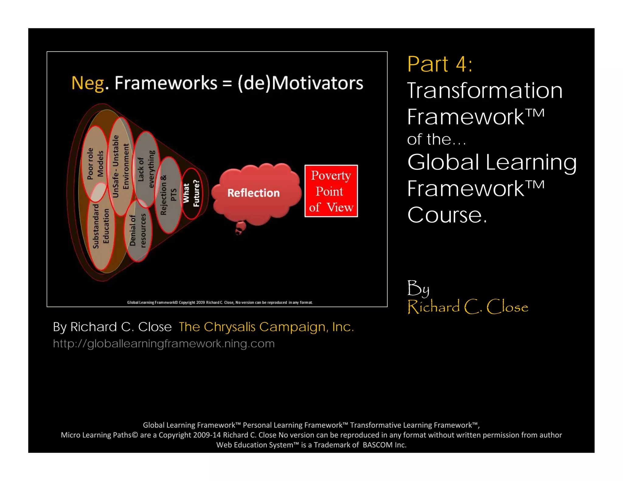 The document outlines the Global Learning Framework, developed by Richard C. Close, focusing on transformative learning processes and personal empowerment through various educational and collaborative methodologies. It discusses the impact of experiences, values, and collaboration on adult learning, particularly in contexts of poverty and entitlement. The framework offers tools for personal growth, including tools for self-reflection and project-based learning, while emphasizing the importance of positive role models and transformative experiences.