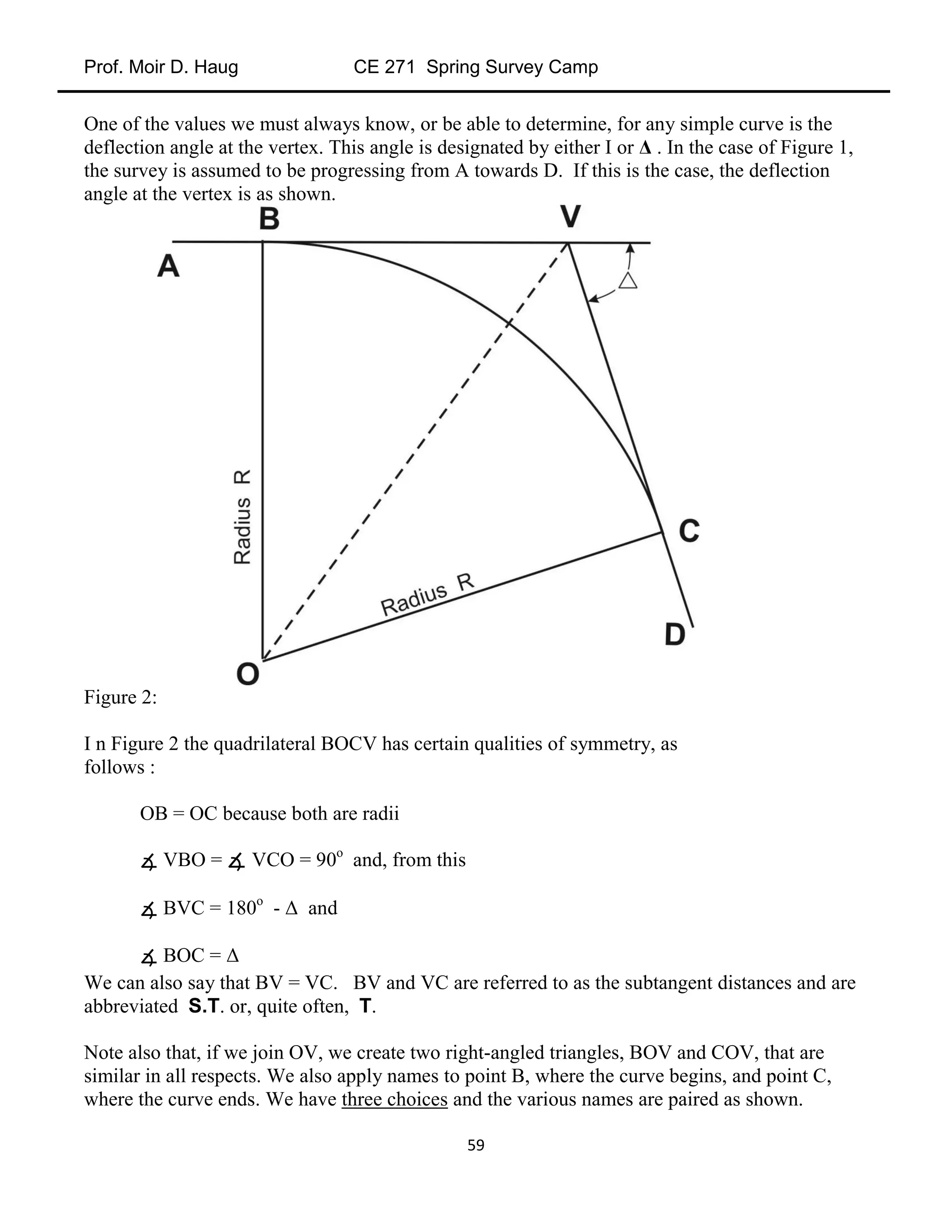 3. The document provides an example problem calculating values for a given curve with a 40 degree deflection angle, including the radius (R), tangent distance (T), arc length (La), and stationing of points of