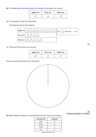 This document contains 22 math questions with explanations and worked examples related to topics like pie charts, percentages, ratios, time, money, operations, geometry, and measurement. The questions range from 1 to 7 marks and cover skills such as interpreting data in tables and charts, calculating percentages, solving word problems involving rates and time, using scales on maps, and calculating bearings and distances on diagrams.