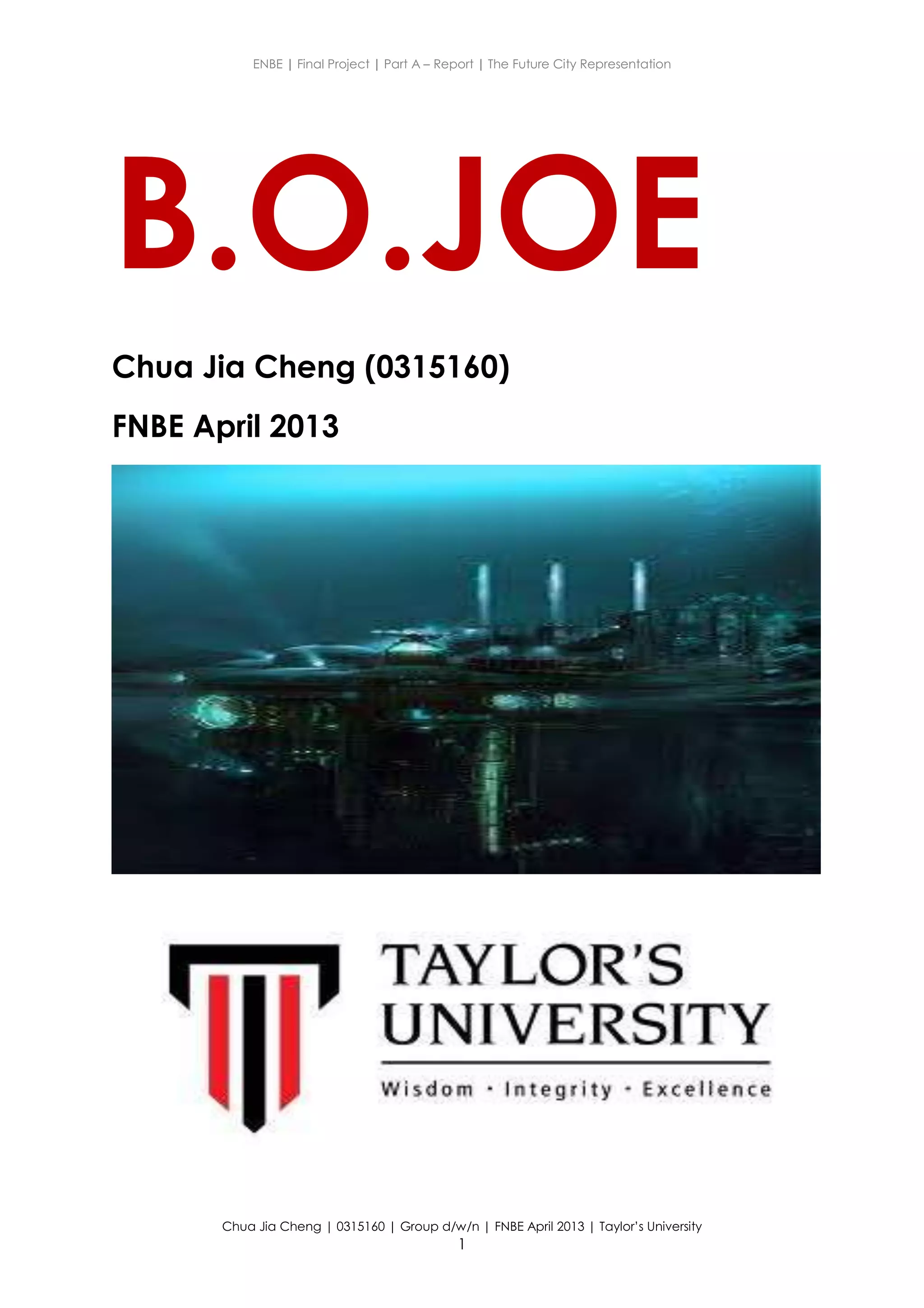 The document describes a future underwater city called B.O.JOE. It was created after the mayor's original city was destroyed by animals who had turned immortal due to deforestation. B.O.JOE is located underwater for safety and provides everything its 100,000 citizens need, including jobs, schools, hospitals, parks, and energy from geothermal, solar, and biomass sources. It is shaped like a diamond to maximize light intake for agriculture. Transportation includes trains along straight lines with multiple stations. The city aims to provide a peaceful life for residents protected from disasters that affect land and air.