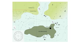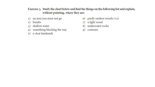 The document contains information related to nautical charts and navigation techniques. It discusses topics such as variation, dead reckoning, fixes, bearings, waypoints, legs, drift, intended course, and chart symbols. It also contains exercises on plotting a course, correcting mistakes, identifying chart symbols, and understanding navigational buoyage systems. The document appears to be from a training course or instruction manual about how to read and use nautical charts.