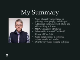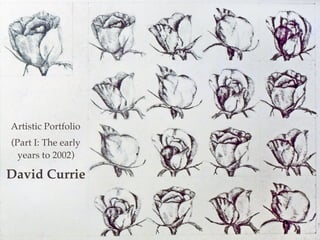 David Currie's artistic portfolio reflects a journey from his early years as a gifted artist in Canada, through various creative phases in Toronto, Vancouver, and Hong Kong. He has over twenty years of experience in painting, photography, and design, along with teaching and freelance work, complemented by an MBA and a scholarship to the Banff Centre of Fine Arts. The document outlines his development and artistic achievements, including solo exhibitions and various teaching roles.
