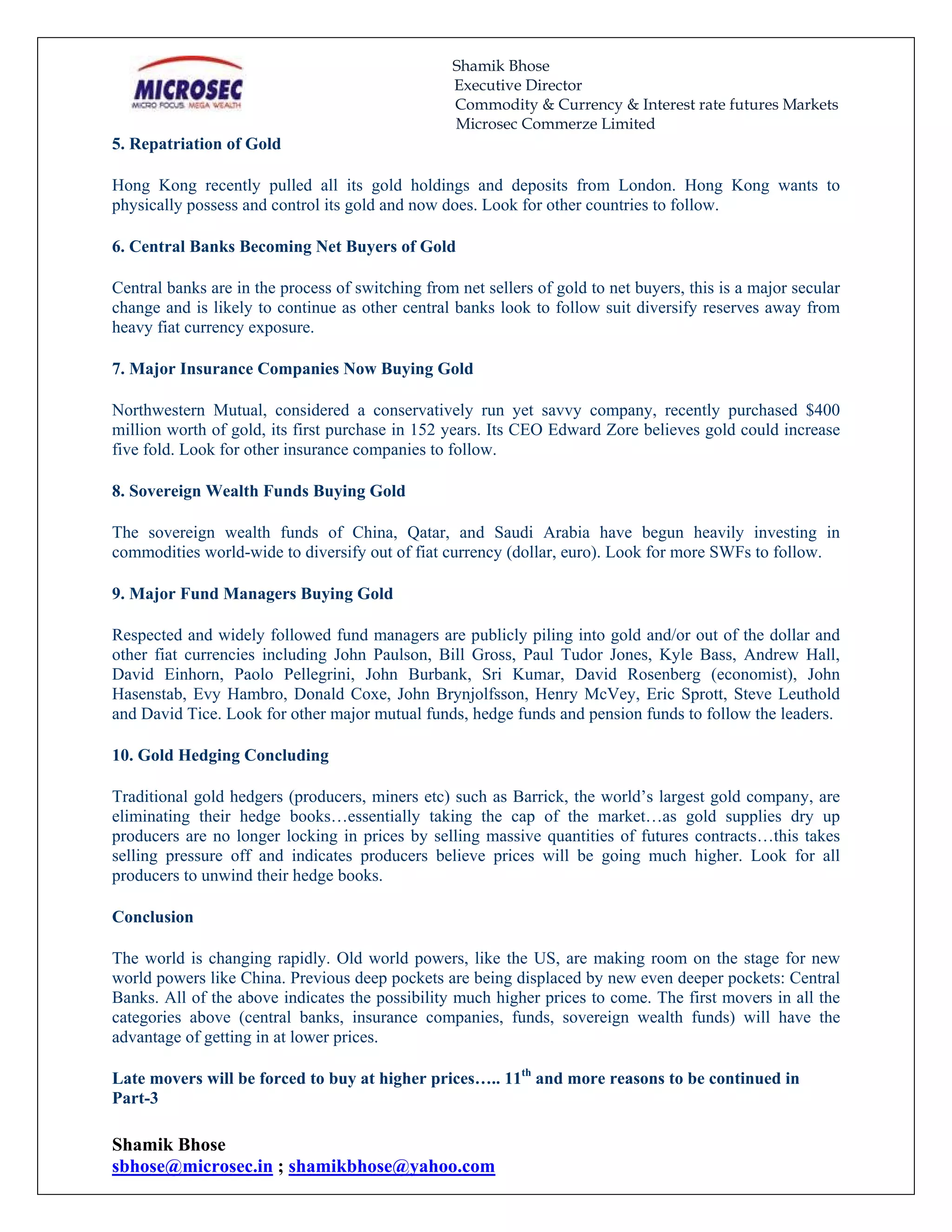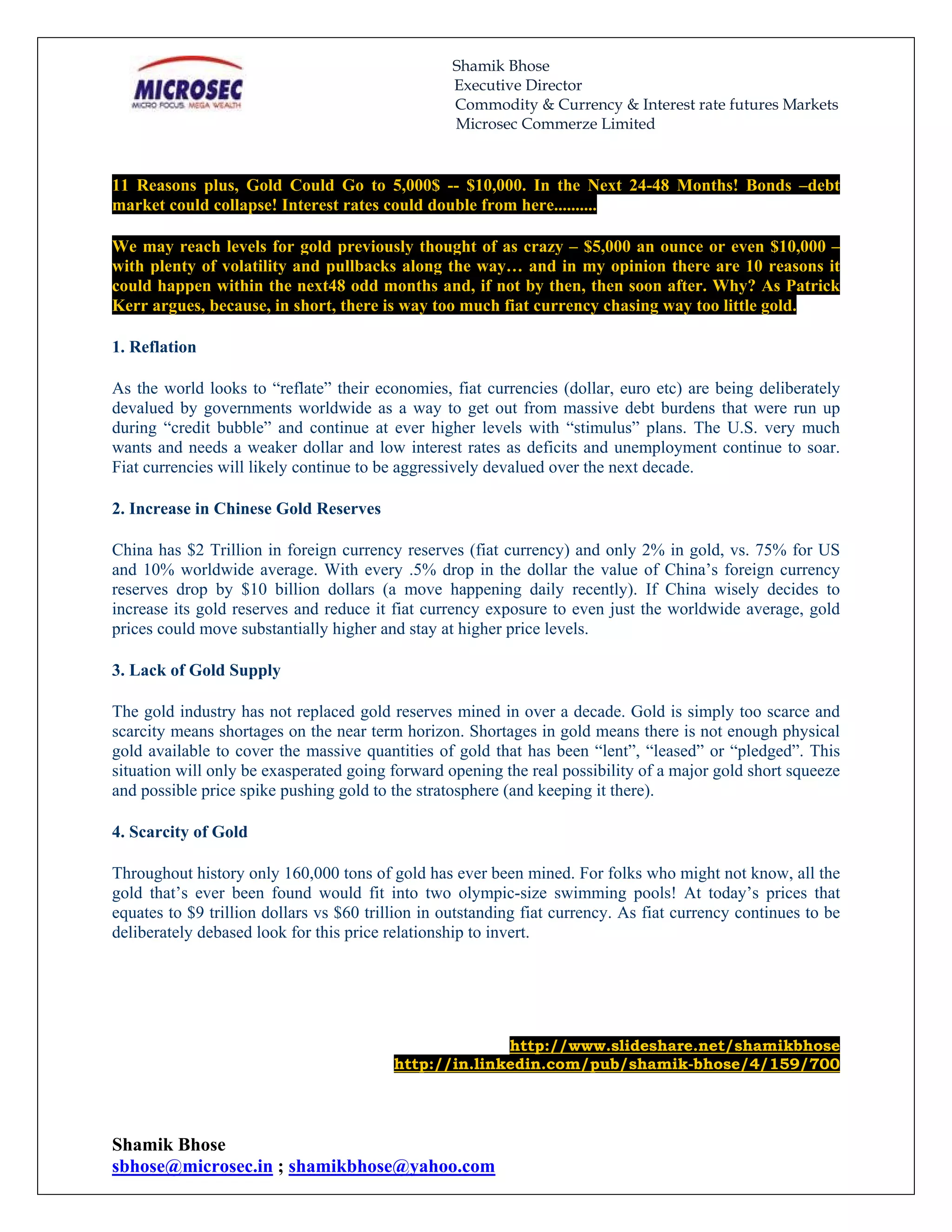 The document discusses 11 reasons why gold prices could rise significantly in the next 2-4 years, reaching as high as $5,000-$10,000 per ounce. It cites factors like heavy government debt leading to currency devaluation, lack of new gold supply discovery, central banks and large companies increasingly purchasing gold to diversify reserves, and widespread analyst predictions of much higher gold prices. Over 130 analysts are referenced who foresee gold's peak price being at least $2,500/ounce, with 90 predicting it will surpass $5,000/ounce, within the next few years.