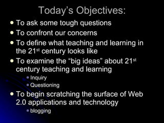 The document discusses the need to prepare students for 21st century skills and learning. It asks tough questions about how to define 21st century teaching and learning, examines big ideas around inquiry and questioning, and explores applications of technology like blogging and Web 2.0. It addresses the changing nature of jobs, information, and knowledge, and argues that schools must redefine themselves to remain relevant in preparing students for an uncertain future.