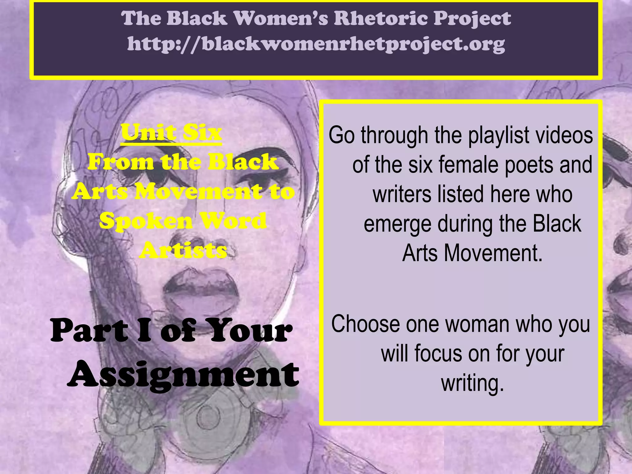The document introduces six influential Black female poets and writers from the Black Arts Movement: Sonia Sanchez, Nikki Giovanni, Gwendolyn Brooks, Jayne Cortez, Ntozake Shange, and Carolyn Rodgers. Students are instructed to choose one of these women to focus on for a writing assignment by reviewing playlist videos about them and the Black Arts Movement.