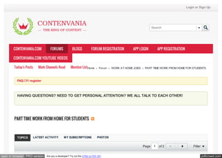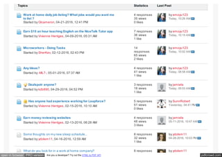 This document is a forum discussion board about part-time work from home opportunities for students. There are several ongoing discussion threads between members about various companies and jobs including teaching English online, website reviewing, and working for Leapforce. The forum provides a place for members to ask questions and get personal advice about finding suitable work from home positions.