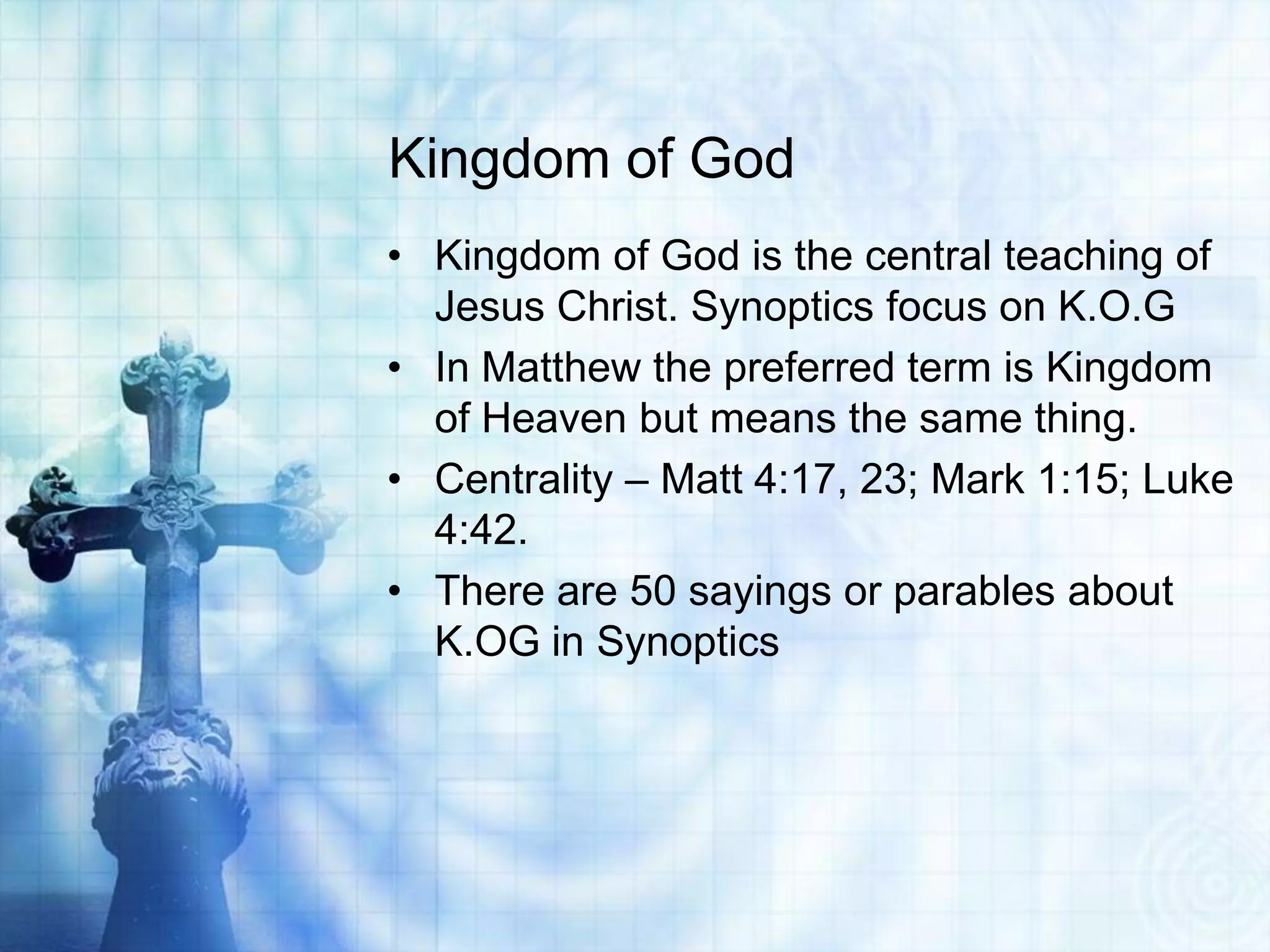 This document discusses the key teachings about the Kingdom of God found in the Synoptic Gospels and other religious texts. It explains that the Kingdom of God was the central message of Jesus, referring to God's authority and rule. While the term was not used in the Old Testament, the idea of God's reign was present. The document analyzes how the concept developed in intertestamental Jewish thought and how Jesus brought the Kingdom near through his words and acts. It also explores how the Kingdom is related to concepts like the Church, Eucharist, and God's reign in contrast to earthly powers.