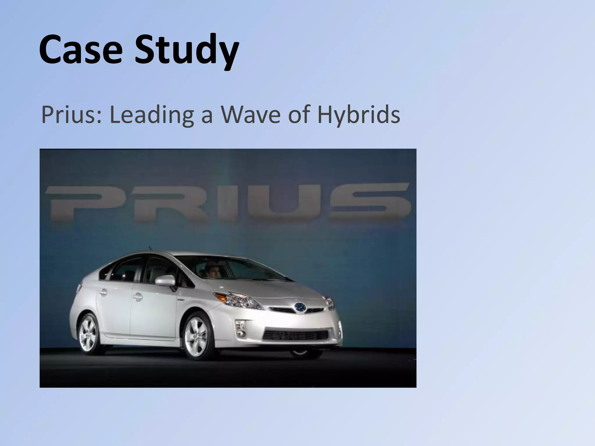 The Prius was successful due to its technological advances, lower price than other hybrids and SUVs, and its ability to appeal to consumers affected by high gas prices. Toyota's launch of the Prius took advantage of society's need for more fuel efficient vehicles when gas prices were rising and people drove uneconomical vehicles. Government incentives further contributed to the Prius' popularity by offering tax breaks for hybrid owners. Competition in the electric vehicle market was growing as most major automakers began introducing electric models across various vehicle classes between 2009-2012.