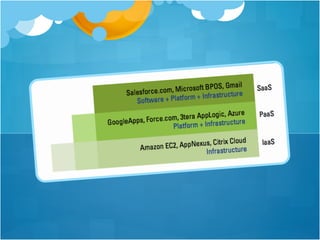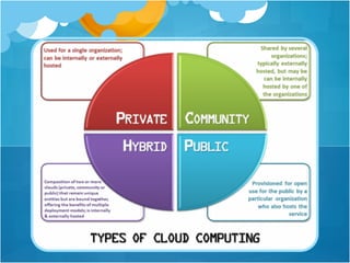 Cloud computing is a model for enabling ubiquitous, convenient, on-demand network access to a shared pool of configurable computing resources (e.g. networks, servers, storage, applications, and services) that can be rapidly provisioned and released with minimal management effort or service provider interaction. Key characteristics of cloud computing include on-demand self-service, broad network access, resource pooling, rapid elasticity, and measured service. Common types of cloud services are Software as a Service (SaaS), Platform as a Service (PaaS), and Infrastructure as a Service (IaaS).