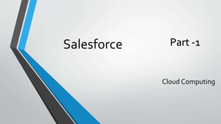Cloud computing is the on-demand delivery of computing resources like servers and data storage over the internet. It allows businesses to access applications via the internet rather than maintaining their own hardware and software. Common service models for cloud computing include SaaS, PaaS, and IaaS. Salesforce is a leader in cloud computing, offering applications for CRM, sales, marketing, and more that are accessed via the internet rather than installed on-premise hardware. This allows companies to work as one team across connected applications and deploy enterprise-wide solutions more quickly than traditional on-premise models.
