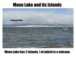 The document provides information about geological formations around Mono Lake in eastern California, including tufa rock formations created by calcium-rich springs, volcanic islands in Mono Lake, evidence of declining lake levels from former shorelines, moraines surrounding lakes, waterfalls, and old metamorphic rock formations. It also summarizes observations from the Eastern California Museum of Native American beaded accessories, and describes the Manzanar War Relocation Center that detained Japanese Americans, as well as images from the area showing geological features like faults, alluvial fans, and plant life.