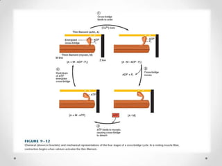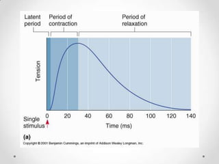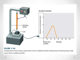 Muscle tension and load are opposing forces that determine the type of muscle contraction. There are three main types of contractions: isometric contractions where the muscle generates force without shortening, and two types of isotonic contractions where the muscle shortens or lengthens while generating force - concentric contractions where the muscle shortens, and eccentric contractions where it lengthens. A single muscle twitch has three phases - a latent period after stimulation, a contraction period where force increases, and a relaxation period where force decreases. Heavier loads result in longer latent periods, slower velocities of shortening, and shorter twitch durations with less shortening distance. As load increases, the velocity of muscle fiber shortening decreases until it reaches zero at maximal isometric