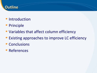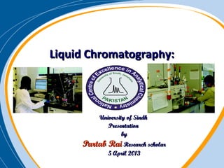 The presentation outlines the principles and applications of liquid chromatography, tracing its history from Tswett's initial discoveries to modern techniques like HPLC and GC. It emphasizes the separation of chemical components based on their interactions with stationary and mobile phases, detailing various chromatography techniques and the role of instrumentation. The conclusions highlight the utility of liquid chromatography for analyzing non-volatile and thermally unstable substances.