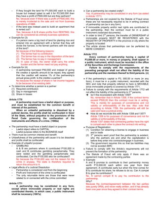 This document summarizes key provisions related to partnerships under Philippine law. It defines a partnership as an agreement between two or more persons to contribute money, property, or industry to a common fund, with the intention of dividing profits. A partnership has a separate legal personality from its partners. The document also provides rules for determining whether a partnership exists, noting that profit-sharing alone does not constitute a partnership. It outlines requirements for partnerships over 3,000 PHP to be in writing and recorded.