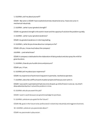 Cesar introduces himself as having studied electricity and mechanics at sena. His greatest strengths are working in teams and quickly solving problems, while his greatest weakness is being slow. He describes the company as producing dairy products and extending milk shelf life. When asked about handling stress and pressure, he responds affirmatively without details. His experience includes working as an operator at Parmalat. He recounts a situation where he made a packaging error but solved the problem in time. His goals are to advance professionally in electricity and electronics engineering while supporting his family.