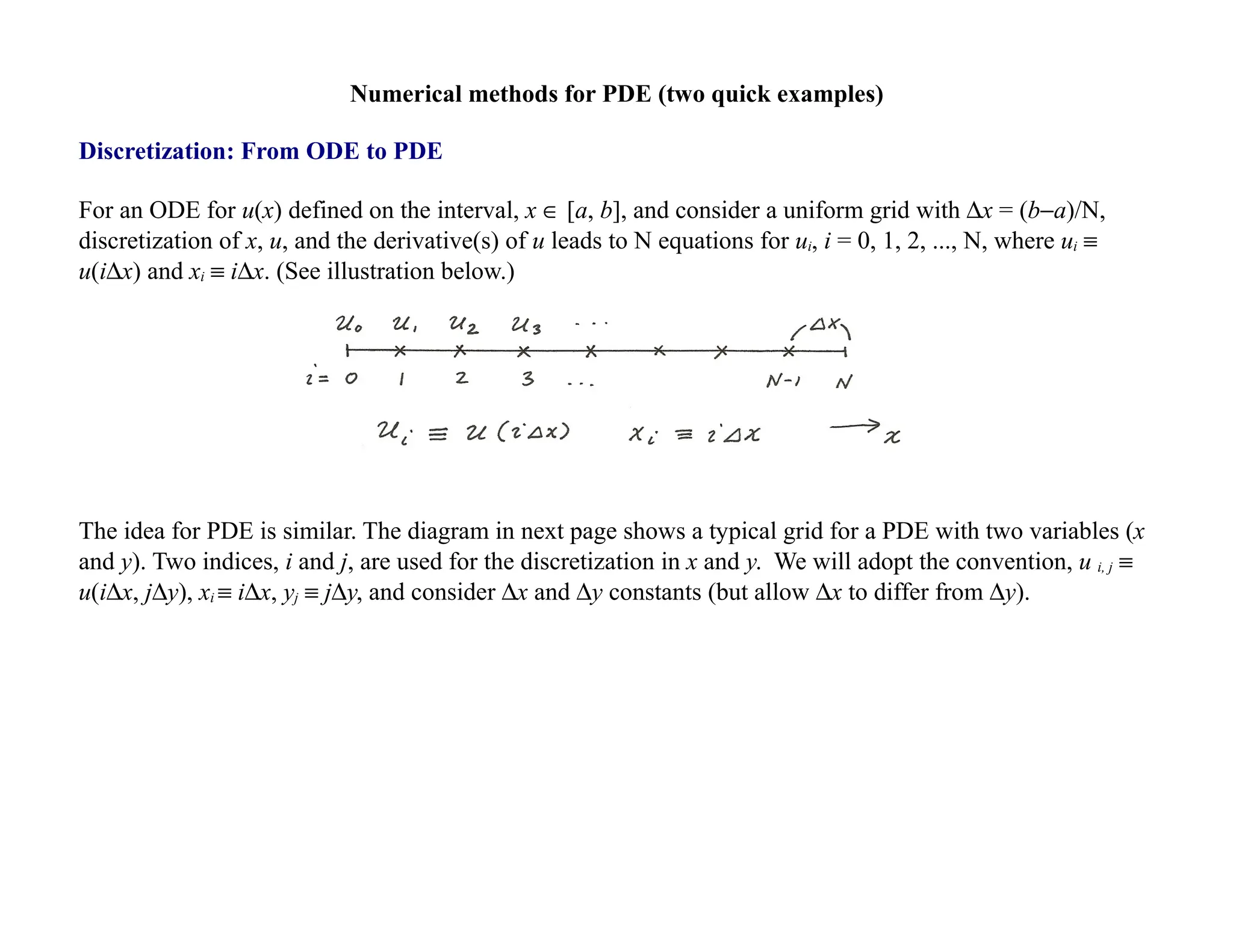The document discusses numerical methods for solving partial differential equations (PDEs), specifically through discretization techniques that transition from ordinary differential equations (ODEs). It provides two examples: the first involves solving the Laplace equation with boundary conditions on a defined square domain, while the second demonstrates the linear advection equation using a grid-based method to calculate solutions given initial conditions. The text emphasizes matrix manipulations and finite difference schemes as foundational tools in approximating the solutions of these PDEs.