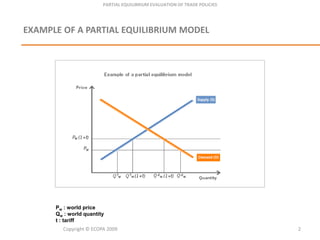 Partial equilibrium models are used to evaluate the impact of trade policy changes on specific markets. They estimate supply and demand curves for a market while holding other markets constant. For example, a partial equilibrium model could show that imposing an import tariff on a product would increase its domestic price, boost domestic supply as local producers become more competitive, reduce demand due to the higher price, and decrease imports. The advantages of partial equilibrium models are that they provide a simple and quick evaluation of trade policies while requiring minimal data.