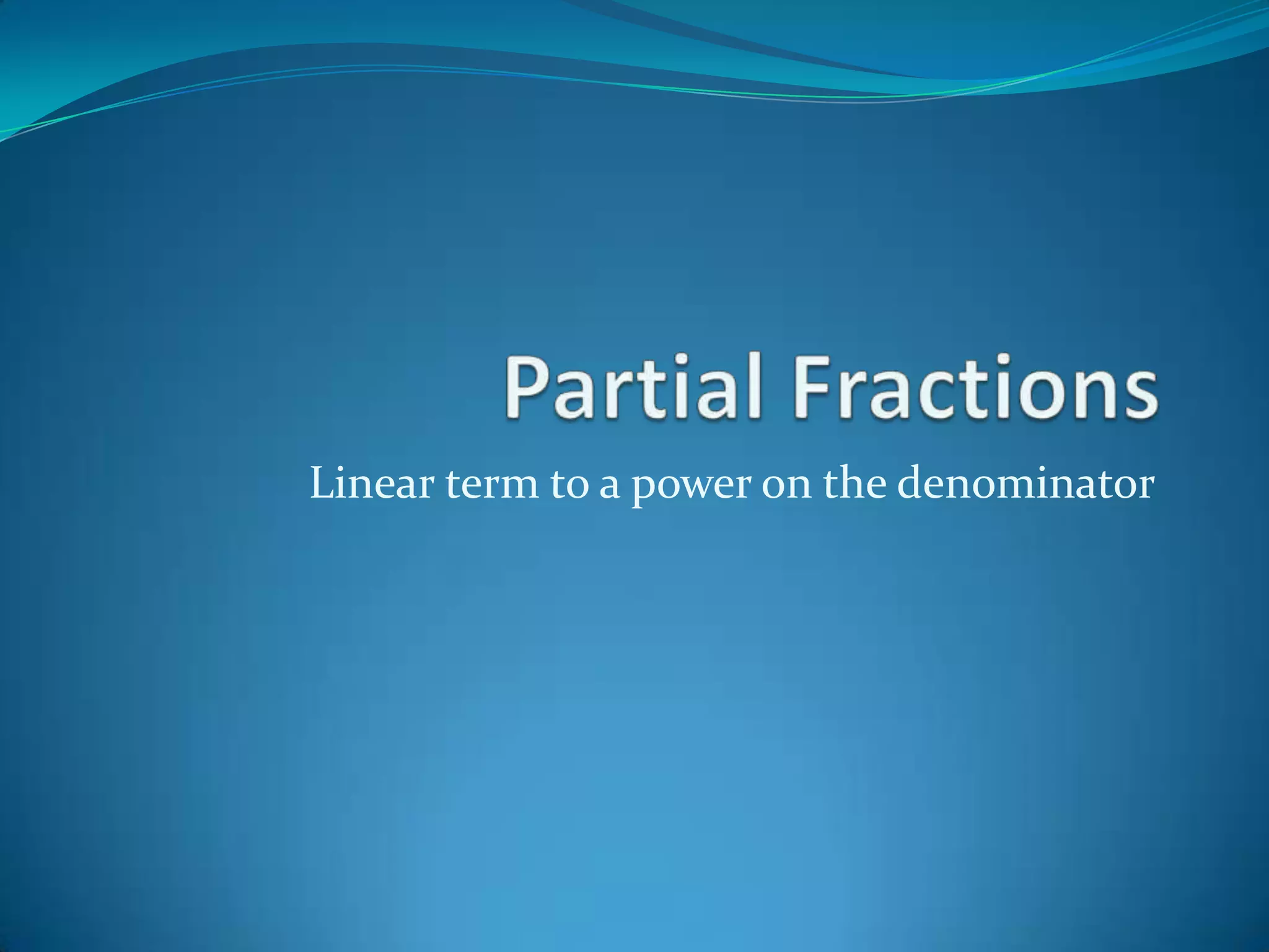 1) Expressions with (ax + b)k in the denominator can be decomposed into terms of the form: ax, b, (ax + b)2, (ax + b)3, etc. 2) To express 8x/(x-3)3 as partial fractions, express it as individual fractions with the factors on the denominator and then with a common denominator. 3) Substitute values for x to solve for the coefficients A and B.