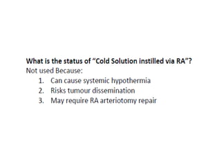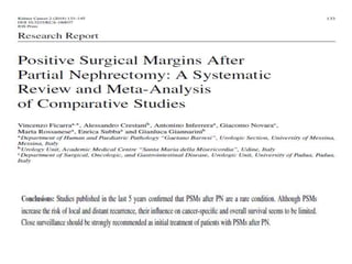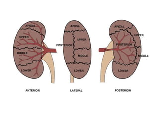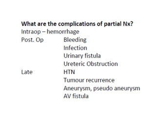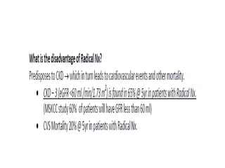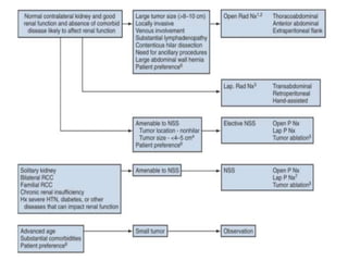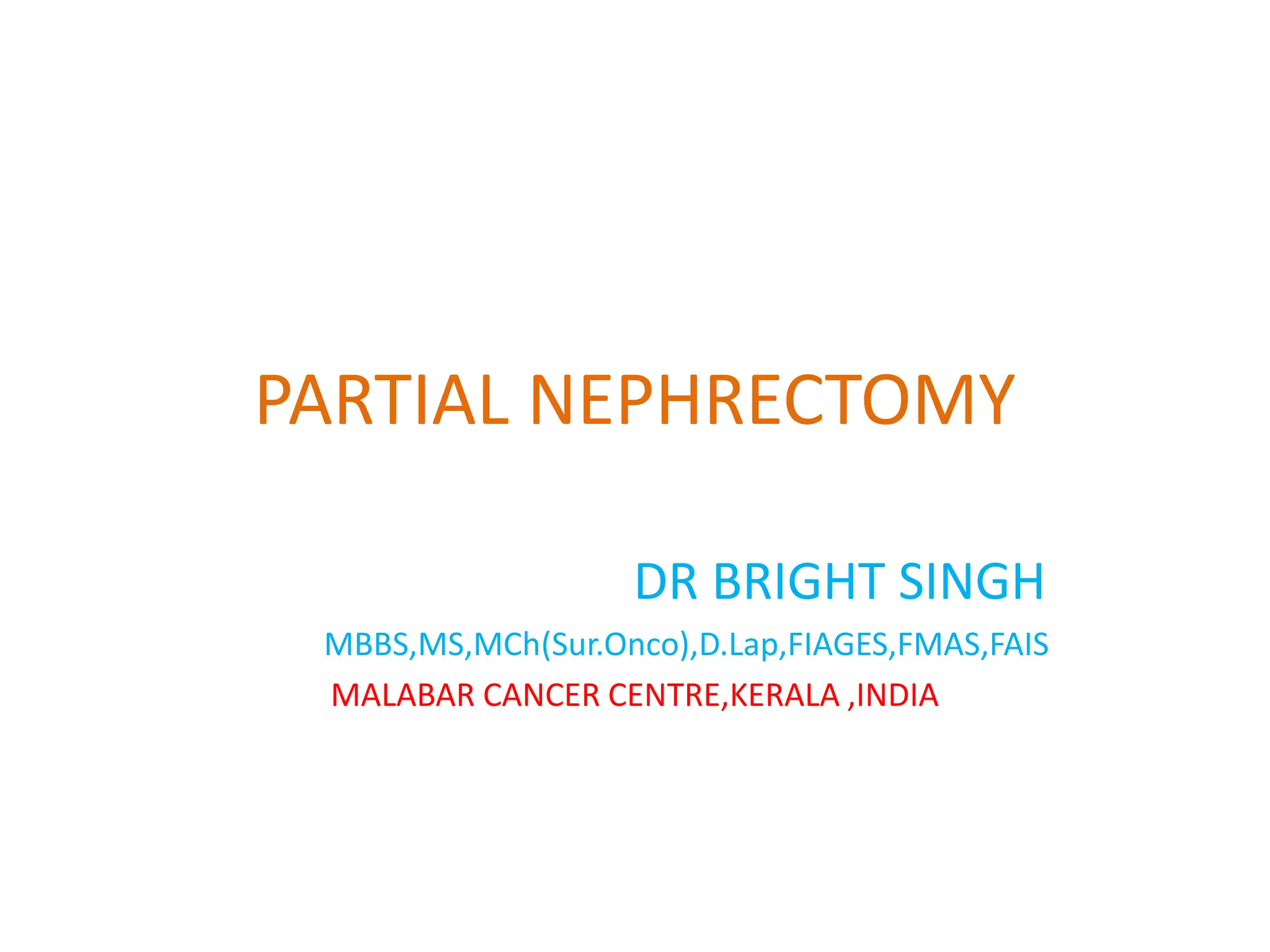 This document provides details on partial nephrectomy, including its history, definition, surgical technique considerations, and approaches. It discusses renal vascular anatomy, tolerance of warm ischemia, and techniques for tumor resection including polar segmental nephrectomy, wedge resection, and transverse resection. Factors for surgical planning like nephrometry score and imaging are also covered. The document aims to inform surgeons on performing partial nephrectomy while maximizing preservation of renal function.