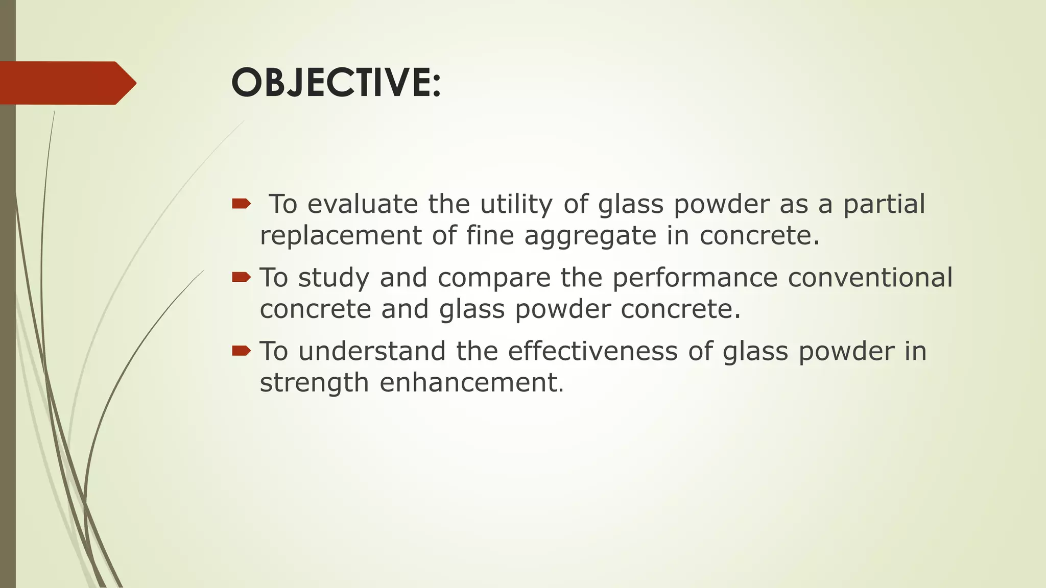 The document evaluates the effectiveness of using glass powder as a partial replacement for fine aggregate in concrete, outlining the methodology and experimental approach taken. It presents findings on compressive, tensile, and flexural strengths, indicating that up to 15-20% replacement enhances concrete strength before decreasing with further replacement. Ultimately, the study concludes that utilizing glass powder in concrete not only strengthens the material but also repurposes waste glass, contributing to sustainability.