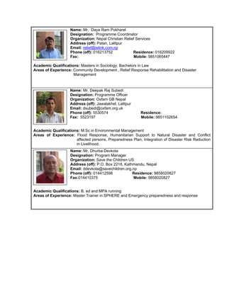 This document provides profiles for 15 participants attending a Disaster Management Training from June 20 to 24, 2007. Each profile includes the participant's name, designation, organization, contact information, academic qualifications, and areas of experience relevant to disaster management. The participants represent organizations involved in disaster preparedness, response, and risk reduction such as the Nepal Army, Red Cross Society, and Department of Hydrology and Meteorology. Their experience includes community development, emergency response, and training in fields like disaster management, humanitarian support, and meteorology.