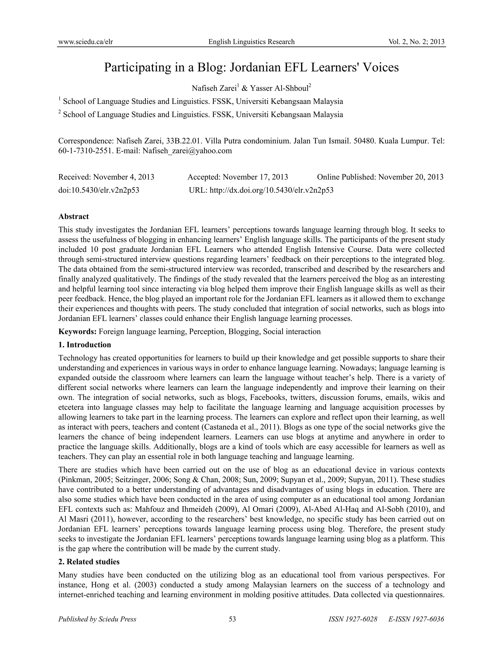 This study explores Jordanian EFL learners' perceptions of language learning through blogging, focusing on 10 postgraduate students enrolled in an English intensive course. Findings indicate that learners found blogging beneficial for enhancing their English skills and facilitating peer interaction, suggesting that integrating blogs into language instruction can positively impact learning. The study emphasizes the role of social networks like blogs in facilitating independent learning and improving language acquisition.