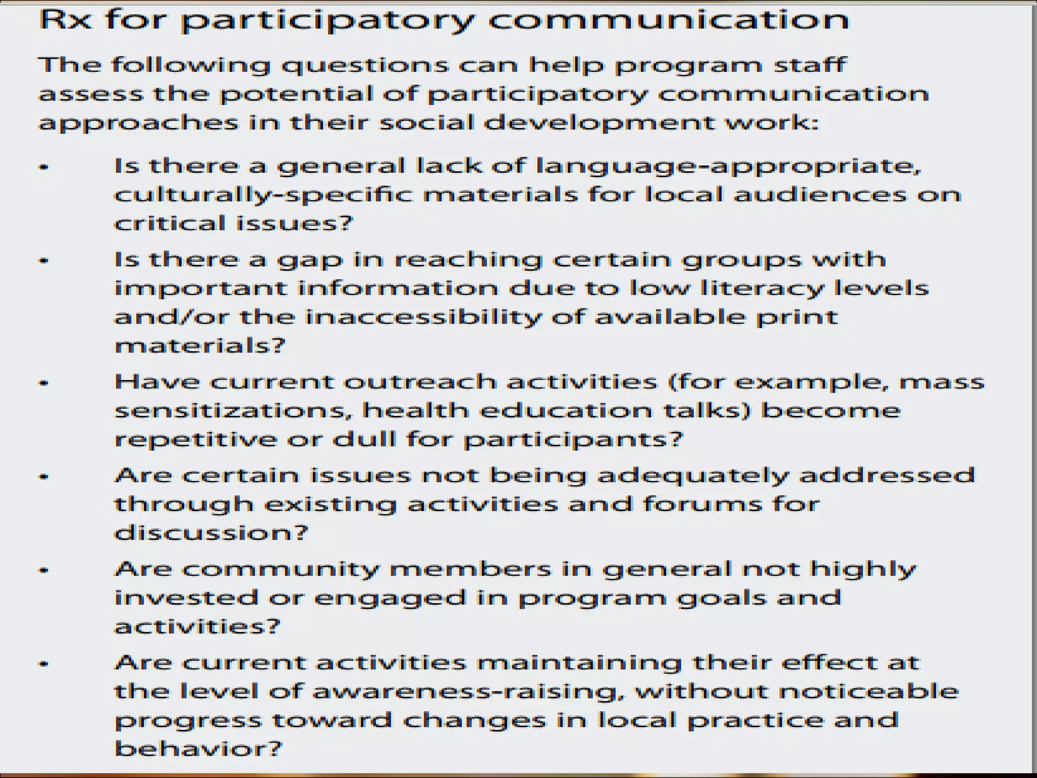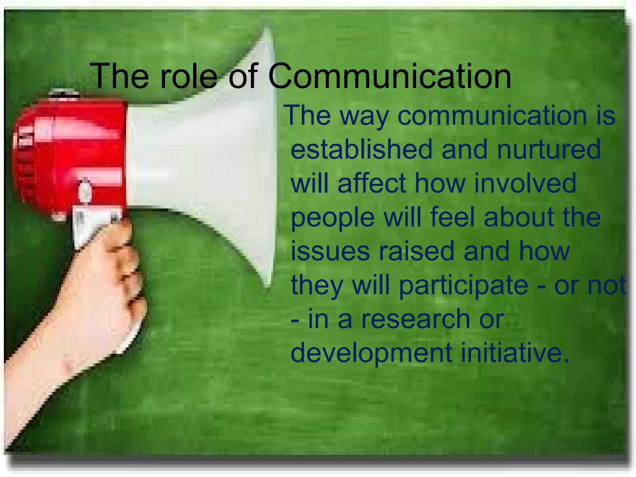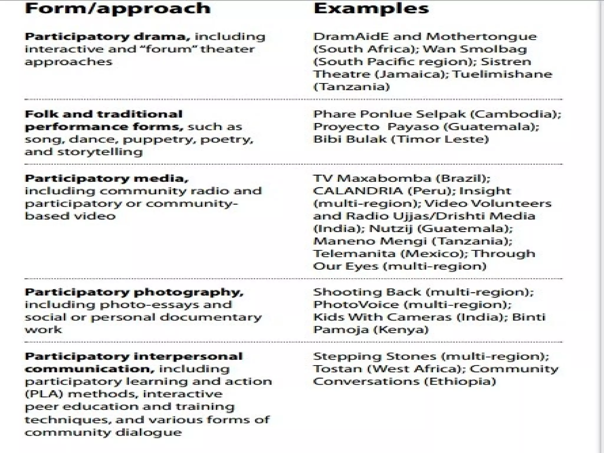 This document discusses participatory communication and its role in development initiatives. It describes participatory communication as a dynamic process that enables people to be engaged in issues impacting their lives and empowering them to make decisions. The key aspects covered include preliminary situation assessments with stakeholders, designing communication strategies collaboratively, developing and pre-testing messages and materials, implementing and evaluating the initiatives, and ensuring participation at all stages of the process. Examples are provided of participatory methods used in different community projects like videos, photo novella, and community research systems that facilitate reflection and action.