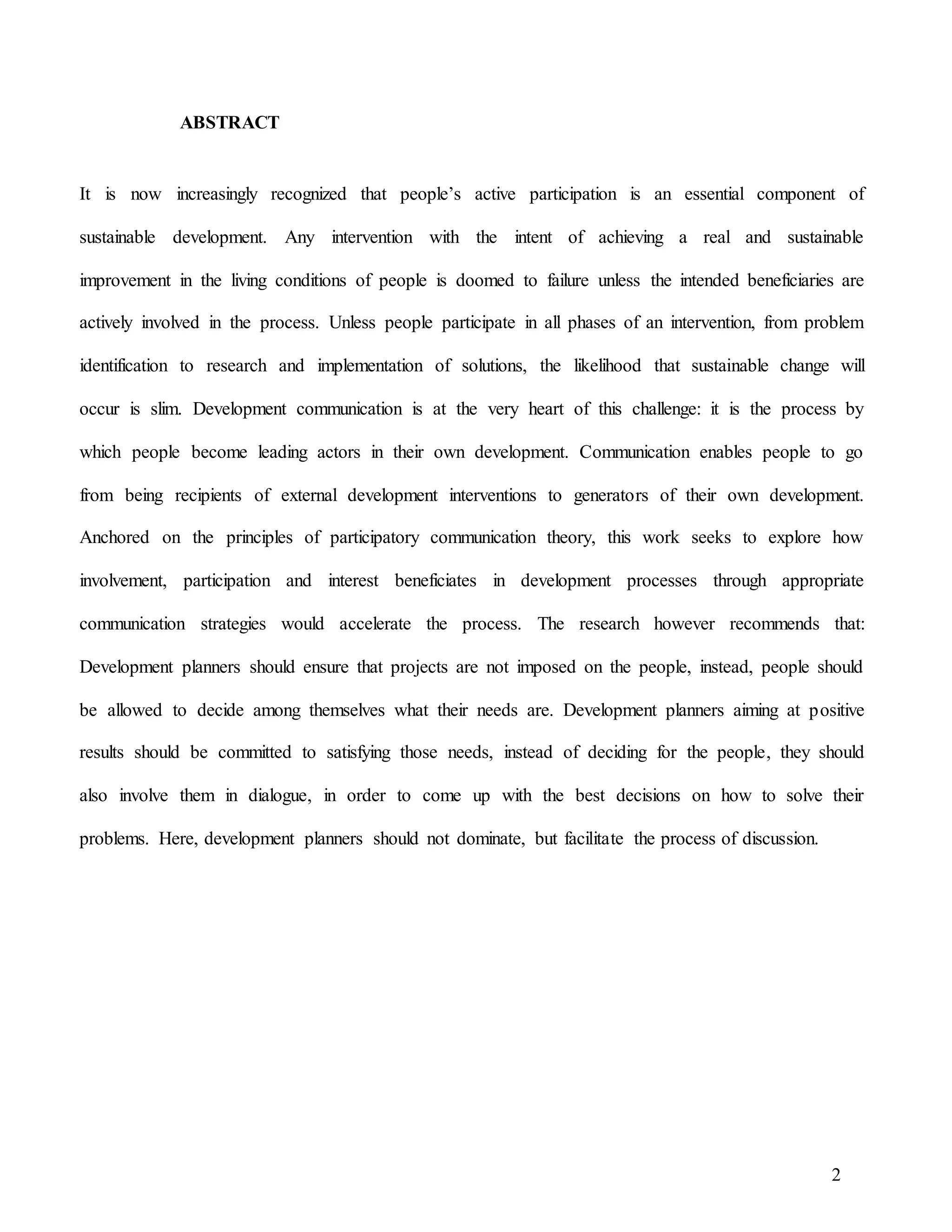 The document analyzes the importance of participatory development communication in Nigeria's development processes, emphasizing that active community involvement is essential for sustainable improvements in living conditions. It critiques traditional top-down approaches and advocates for dialogue-driven strategies that allow beneficiaries to shape their own development needs. The research also evaluates the Community and Social Development Project (CSDP) in Taraba State, highlighting its successful implementation through participatory communication principles and the positive impact on local communities.