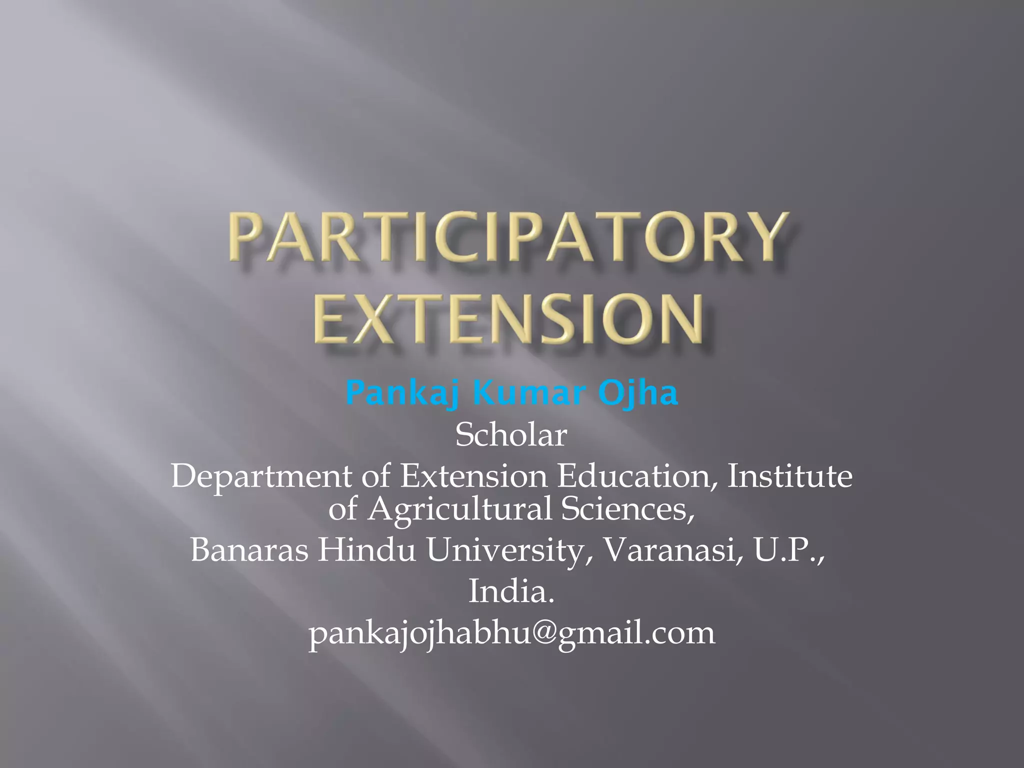 This document discusses participatory extension approaches (PEA) as an alternative to the traditional transfer of technology (ToT) model for rural extension. It outlines some key characteristics of PEA, including integrating community mobilization, promoting farmer experimentation and capacity building, and facilitating equitable participation. PEA emphasizes joint learning among farmers, researchers, and extension agents and positioning farmers as decision-makers in the innovation process rather than passive recipients of externally-developed technologies. The role of extension agents shifts from teacher to facilitator of farmer-led analysis, planning, implementation and reflection.