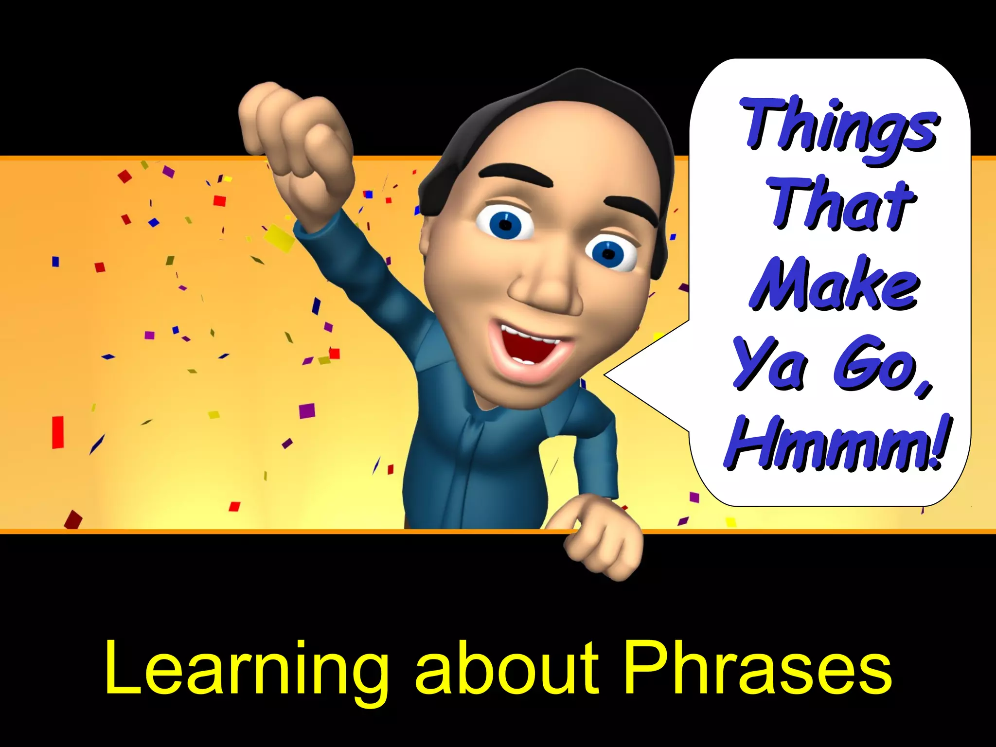 The document discusses different types of phrases including prepositional phrases, verbal phrases, participial phrases, infinitive phrases, gerund phrases, and misplaced or dangling modifiers. It provides examples and explanations of each type of phrase and how they function within sentences.