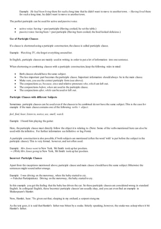 There are three types of participles in English: present, past, and perfect. The present participle ends in "-ing" and is used in progressive tenses, adjectives, and gerunds. The past participle is used in perfect tenses and the passive voice. Both the present and past participles can be used to shorten sentences by combining clauses with the same subject. The perfect participle combines clauses where one action is completed before another starts. Participles are useful for combining information concisely in writing.