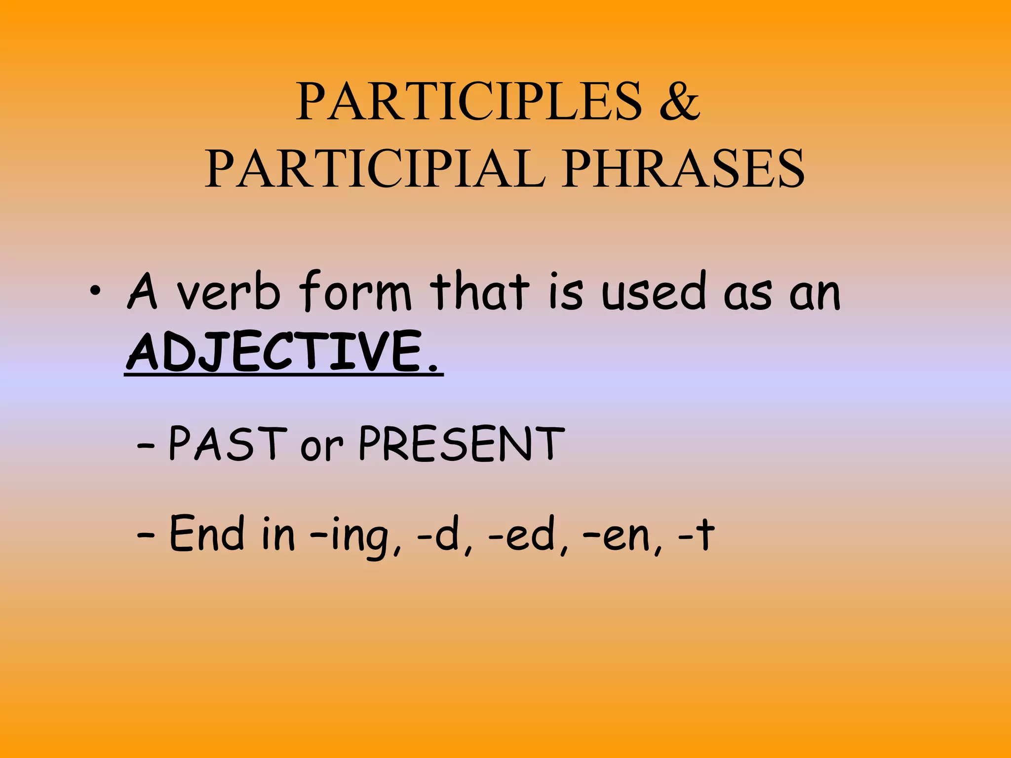 This document discusses participles and participial phrases. A participle is a verb form used as an adjective that ends in -ing, -d, -ed, -en, or -t. A participial phrase consists of a participle plus any modifiers. To identify a participle or participial phrase, find the subject and real verb, then look for other verb-like words. Examples are provided to demonstrate how participles and participial phrases modify nouns and pronouns.