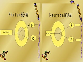 This document discusses various particle beams used in radiation therapy, including their properties and effectiveness. It states that proton beams have superior dose distribution compared to photon beams but lower LET. Neutron beams have high LET properties but poor dose distribution. Heavy charged particle beams like carbon ions have both superior distribution and high LET. BNCT uses boron compounds and neutrons to specifically target tumor cells but is limited by availability and cost. Overall, the document provides an overview of different particle therapies and their advantages over conventional photon radiation.